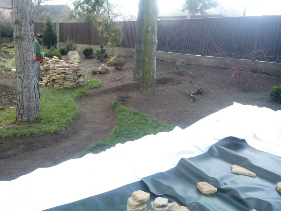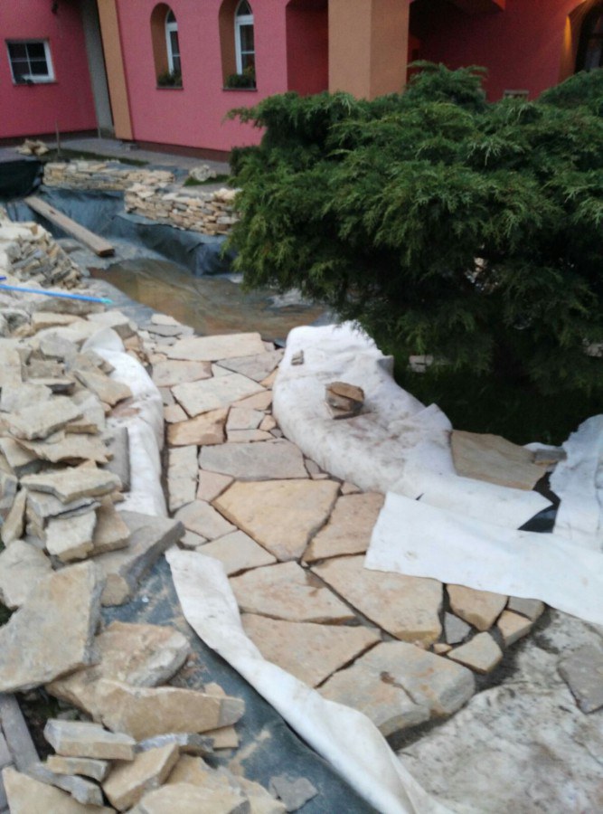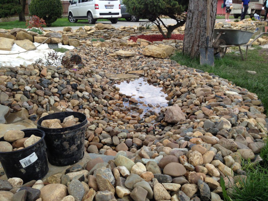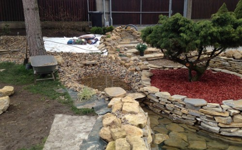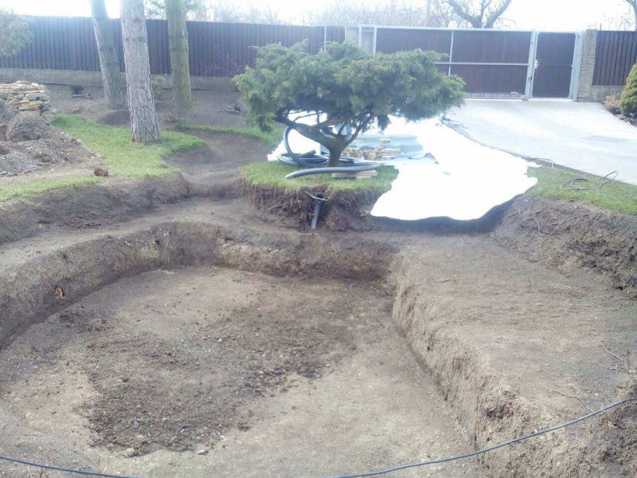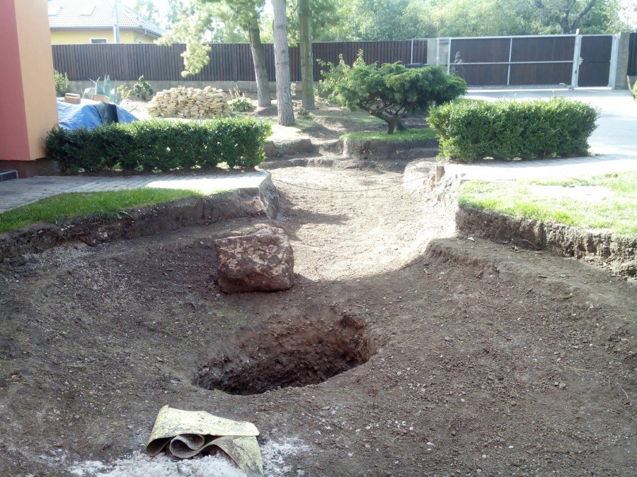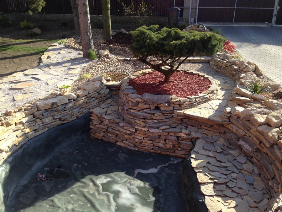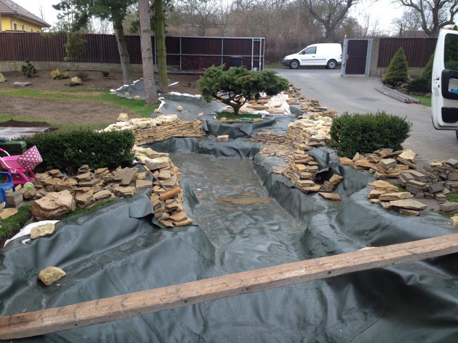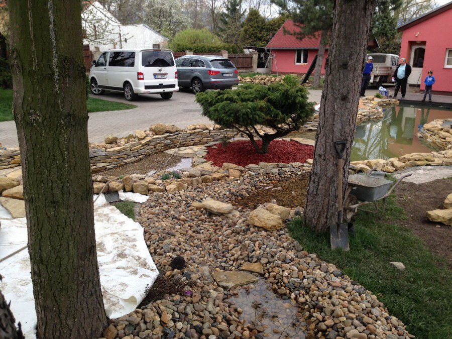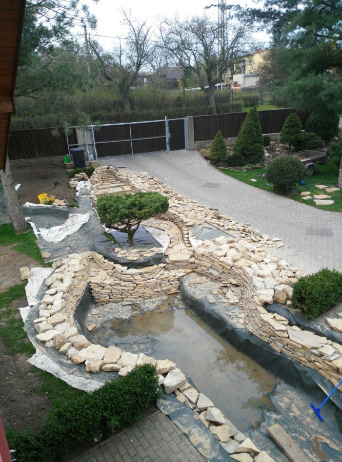Realizace tohoto jezírka byla zahájena v září roku 2015, kdy byl vytyčen tvar jezírka s potoky. Přáním klientů bylo, aby byl zachován ostrůvek s okrasným keřem jalovcem. Zakomponování ostrůvku bude vyřešeno dvěma potoky, které budou kolem ostrůvku vtékat do jezírka. První bude z kačírku a druhý bude z pískovcových kamenů. Po vykopání požadovaných tvarů jezírka a potoků, došlo k položení technologie a vypískování. Následně pak proběhla pokládka geotextílie 500 g a svařila se na míru fólie Fatra Aquaplast 805 1,5 mm. Poté začala jedna z náročnějších etap, vyskládání stěn a břehů jezírka i potoků okrasným pískovcem.