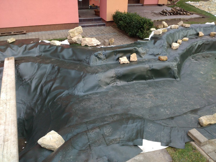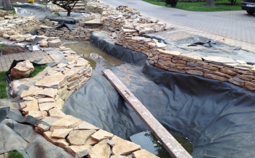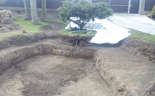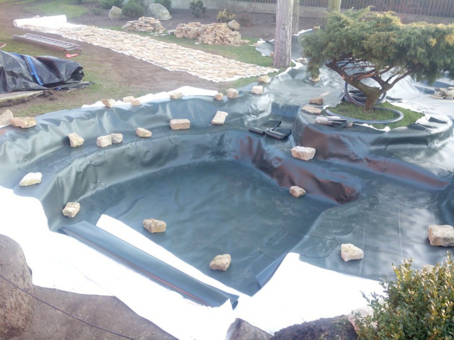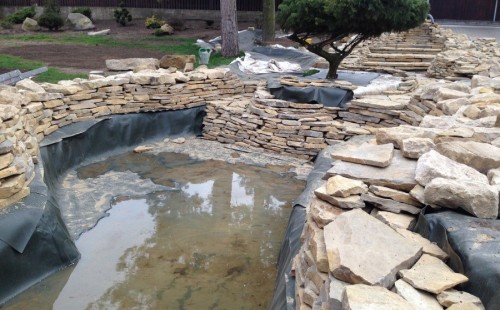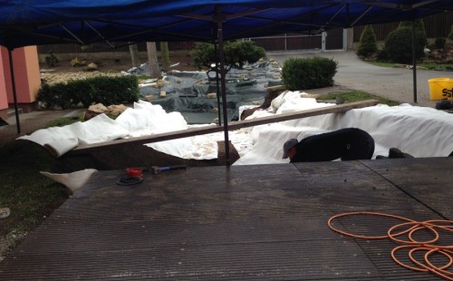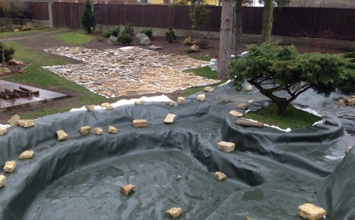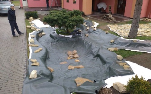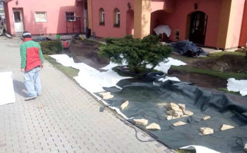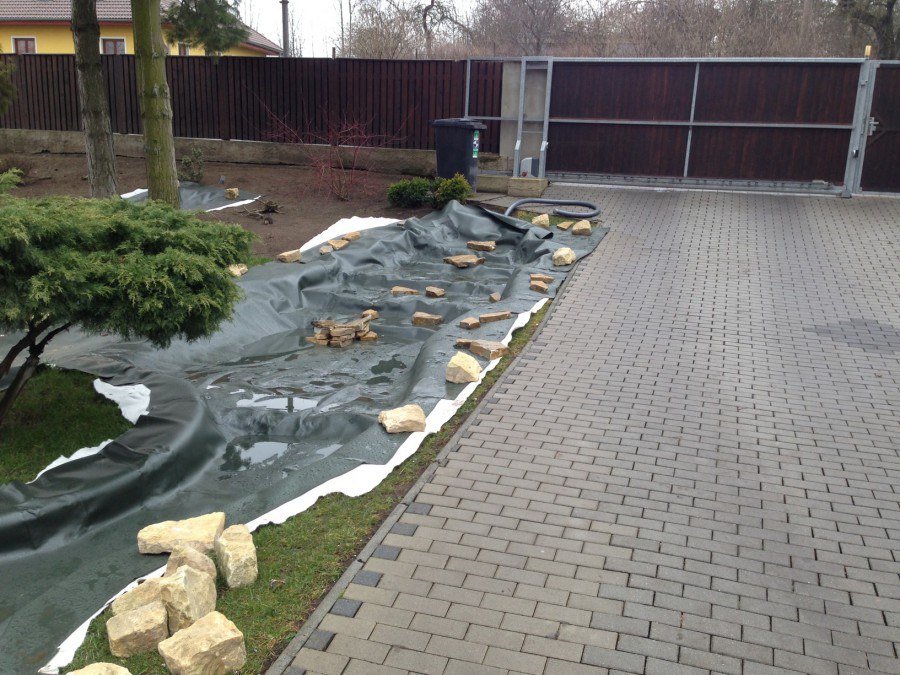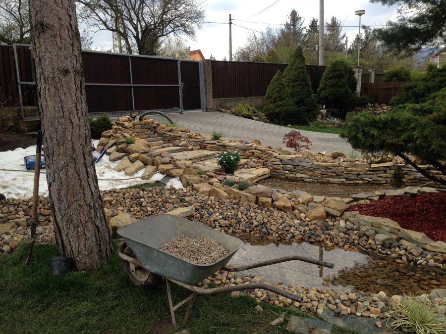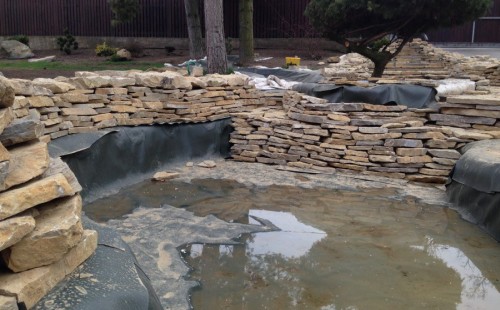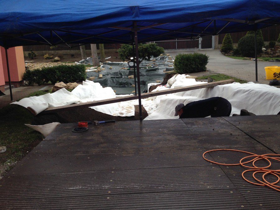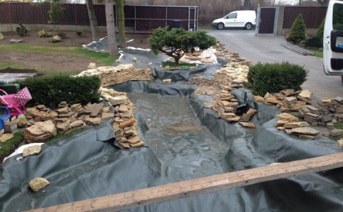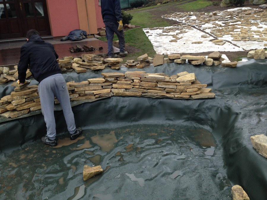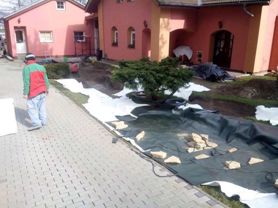 Realizace tohoto jezírka byla zahájena v září roku 2015, kdy byl vytyčen tvar jezírka s potoky. Přáním klientů bylo, aby byl zachován ostrůvek s okrasným keřem jalovcem. Zakomponování ostrůvku bude vyřešeno dvěma potoky, které budou kolem ostrůvku vtékat do jezírka. První bude z kačírku a druhý bude z pískovcových kamenů. Po vykopání požadovaných tvarů jezírka a potoků, došlo k položení technologie a vypískování. Následně pak proběhla pokládka geotextílie 500 g a svařila se na míru fólie Fatra Aquaplast 805 1,5 mm. Poté začala jedna z náročnějších etap, vyskládání stěn a břehů jezírka i potoků okrasným pískovcem.