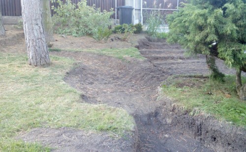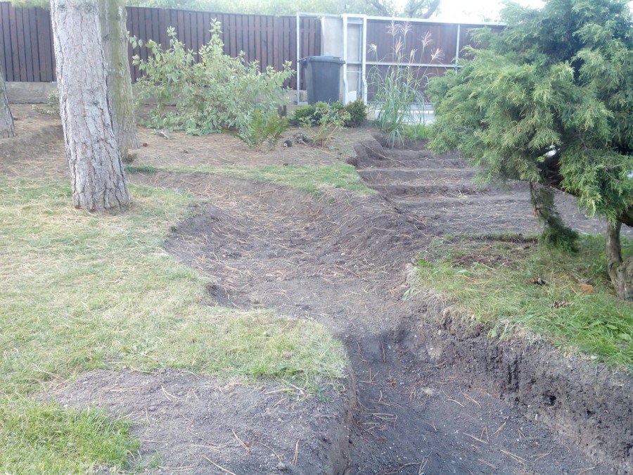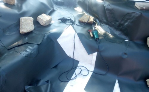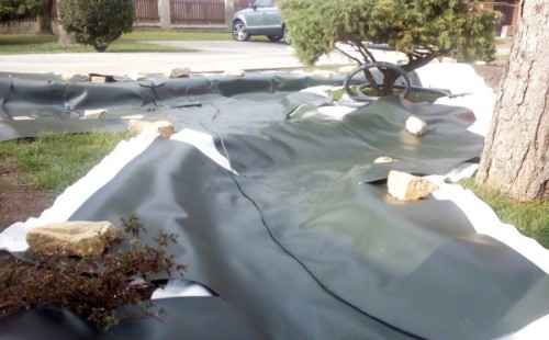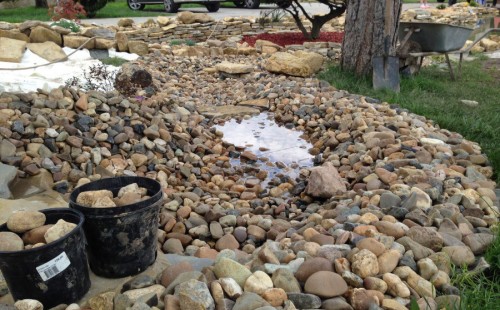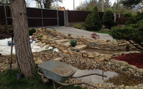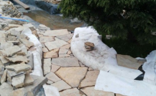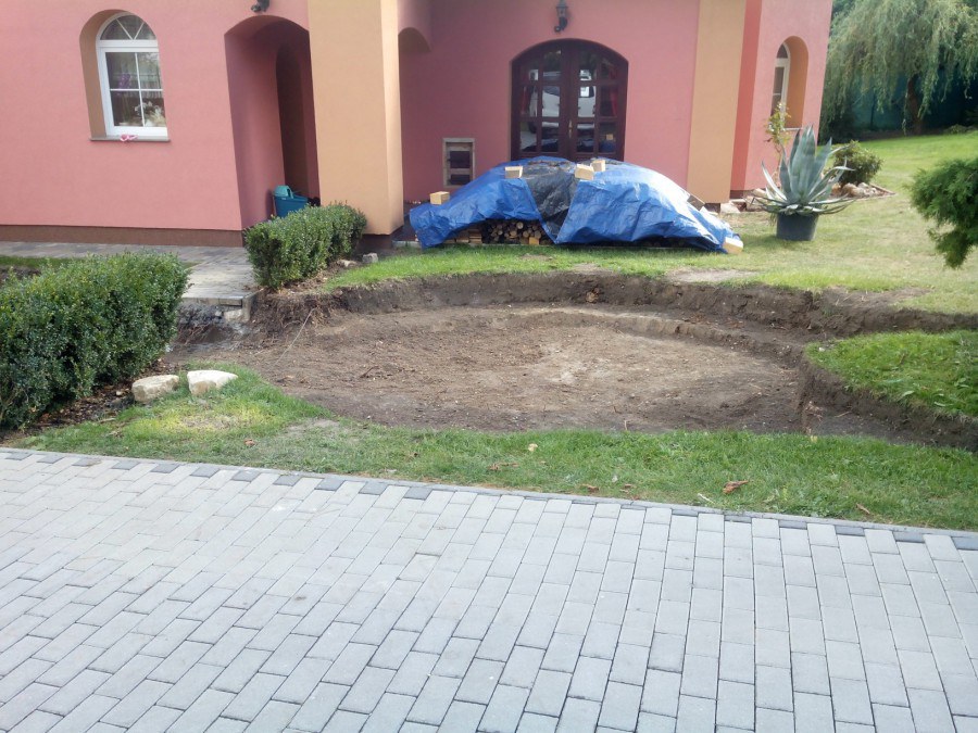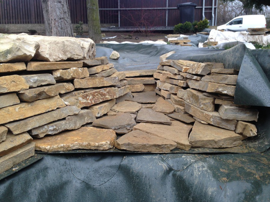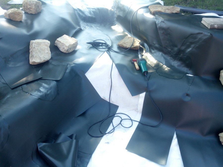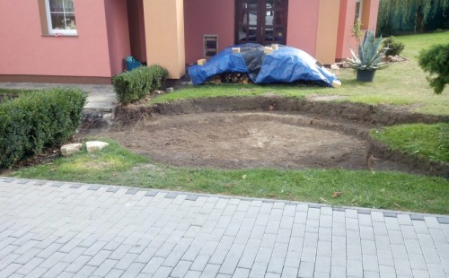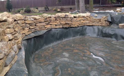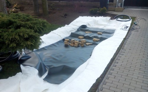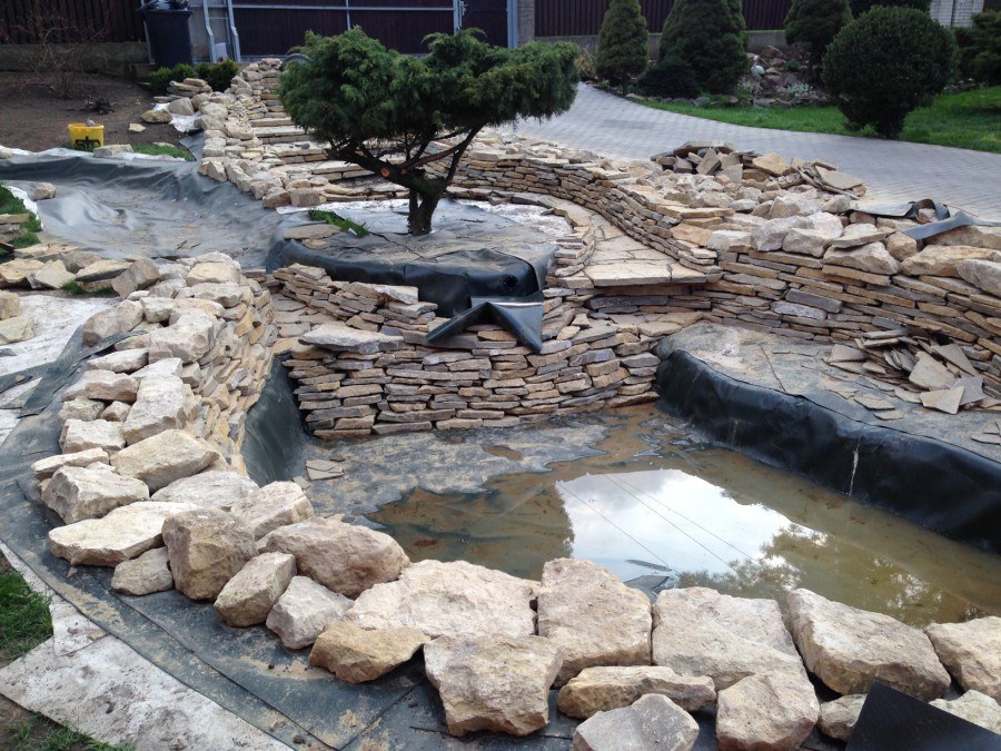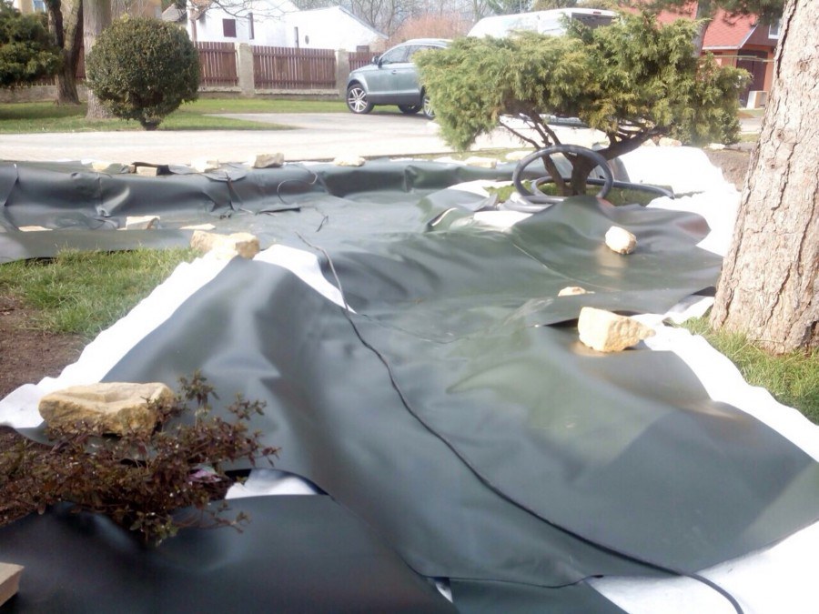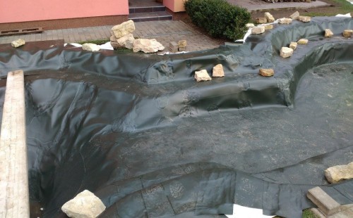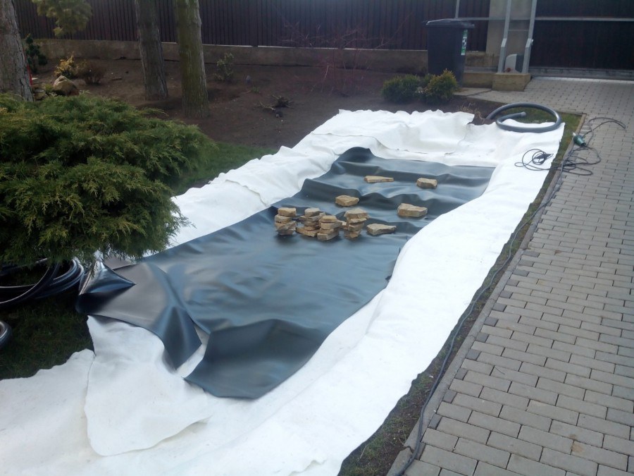 Realizace tohoto jezírka byla zahájena v září roku 2015, kdy byl vytyčen tvar jezírka s potoky. Přáním klientů bylo, aby byl zachován ostrůvek s okrasným keřem jalovcem. Zakomponování ostrůvku bude vyřešeno dvěma potoky, které budou kolem ostrůvku vtékat do jezírka. První bude z kačírku a druhý bude z pískovcových kamenů. Po vykopání požadovaných tvarů jezírka a potoků, došlo k položení technologie a vypískování. Následně pak proběhla pokládka geotextílie 500 g a svařila se na míru fólie Fatra Aquaplast 805 1,5 mm. Poté začala jedna z náročnějších etap, vyskládání stěn a břehů jezírka i potoků okrasným pískovcem.