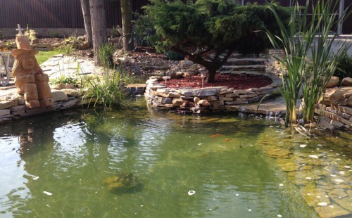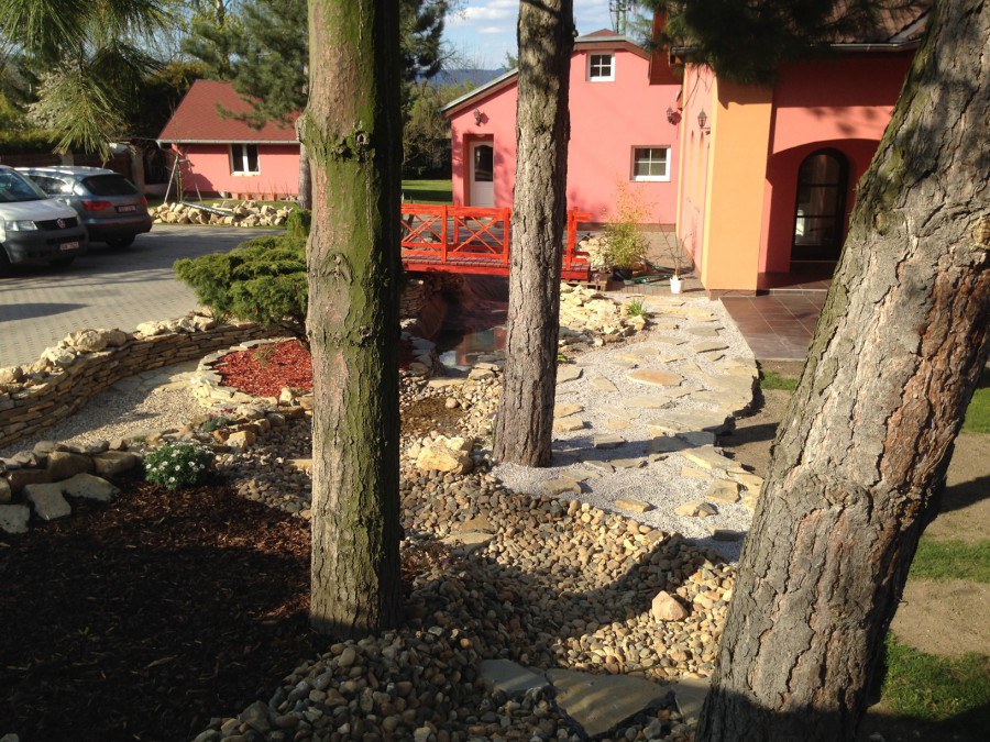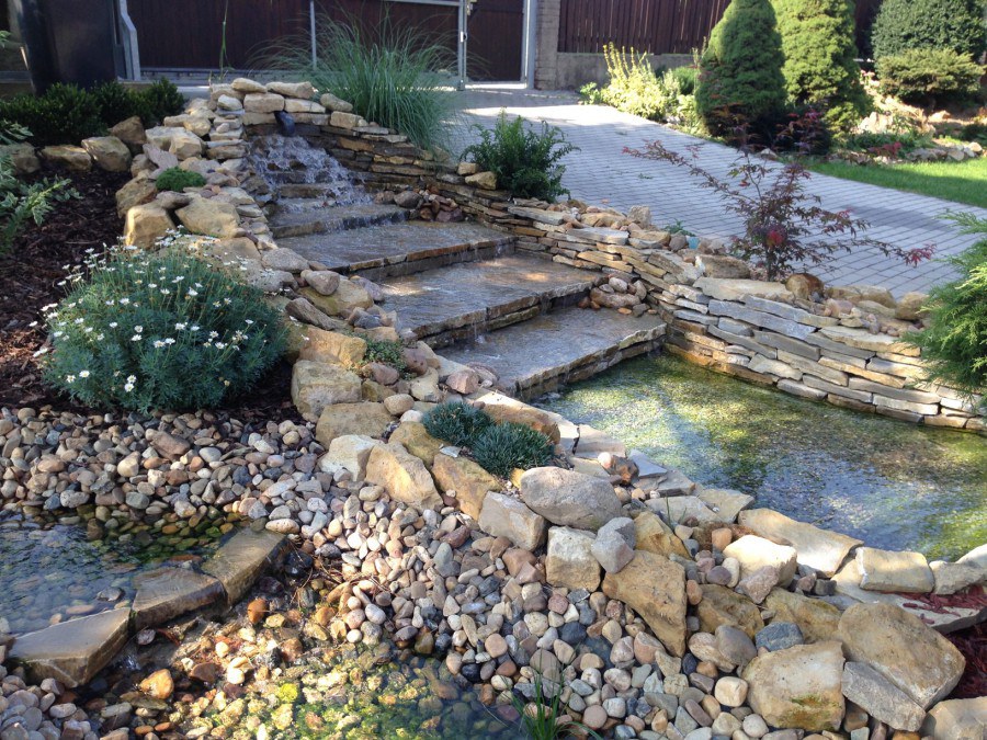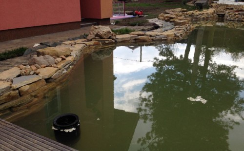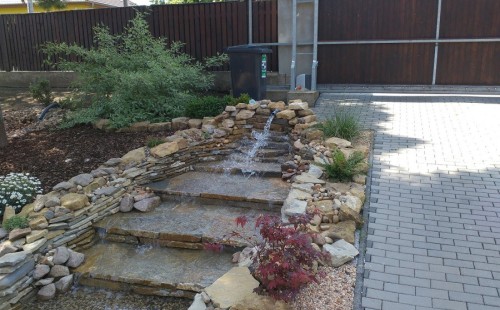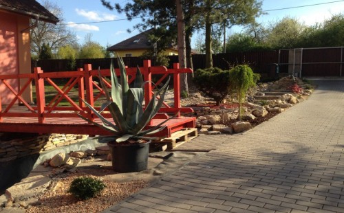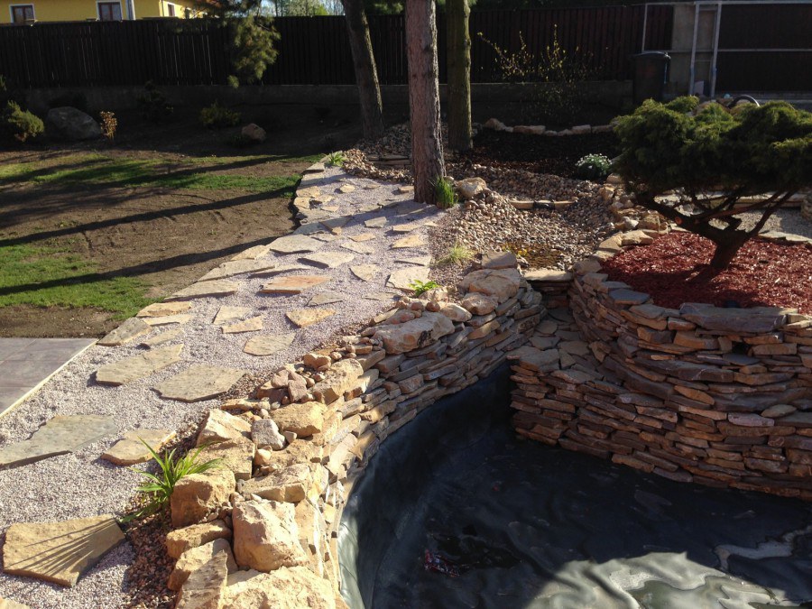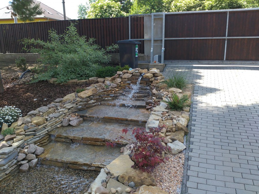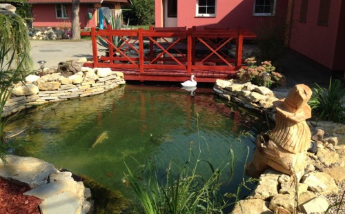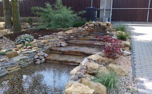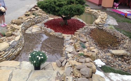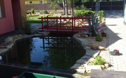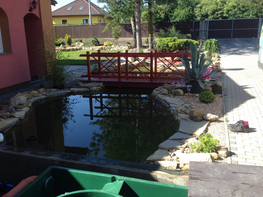 Do tohoto okrasného jezírka byli vypuštěni KOI kapři a jeseteři. Jezírko se stalo dominantou celého dvorku. Klient si nechal vytvořit okrasnou lávku přes jezírko, odkud může krmit a pozorovat své rybí miláčky.