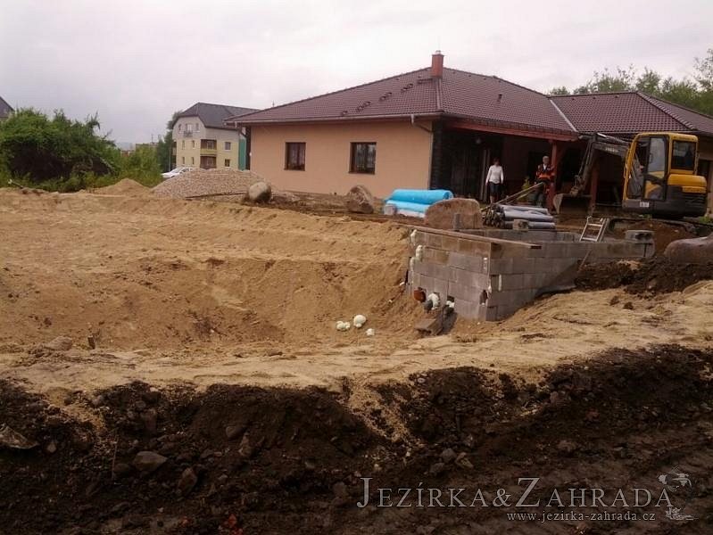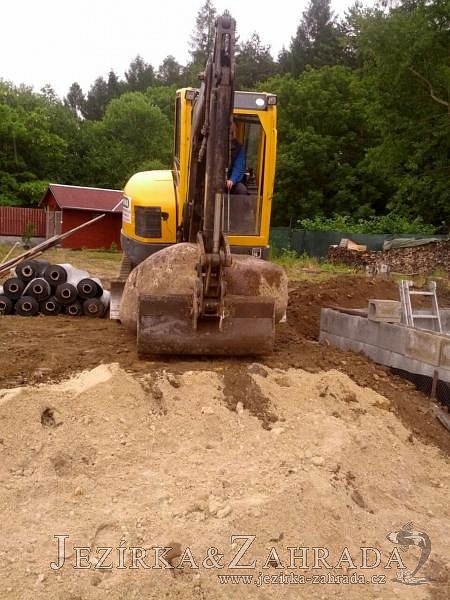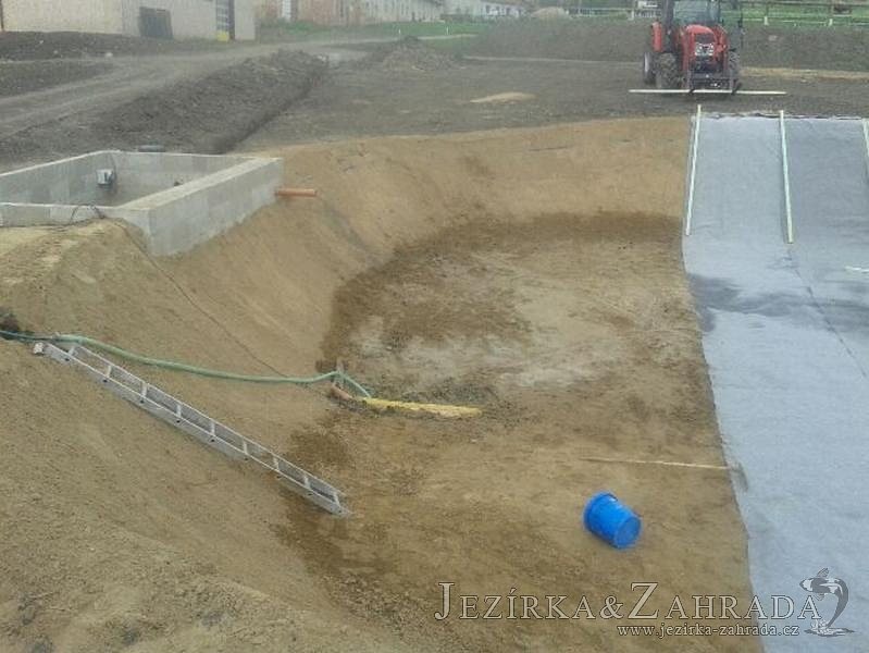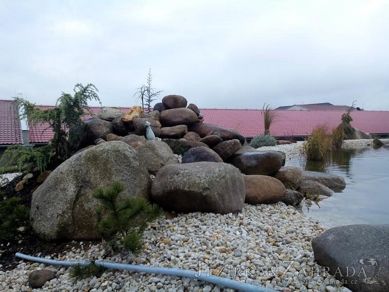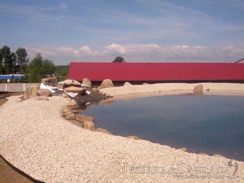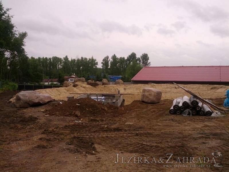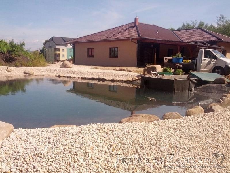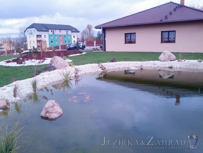 Pod naším technickým dozorem se začalo stavět okrasné jezírko v Sokolově. Nejprve se zakreslil tvar jezírka a technické místnosti, které se následně vybagrovali. Jezírko se vypískovalo, položilo se potrubí pro technologii - spodní vpusť-gule a do stěny technické místnosti fóliová příruba pro skimmer Oase Aquaskim Gravity a geotextílie 500g. Následně se svařila na míru jezírková fólie Fatra Aquaplast 805/V 1,5mm olivově zelená. Dodávaná technologie: biologicko-mechanický filtr Tripond Center-Vortex C115, 2x UV lampa TMC Pro Pond Advantage 110W, úsporné čerpadlo Oase Aquamax Gravity Eco 20000, vzduchovací čerpadlo Hailea HAP-80. Vytvořil se vodopád a celý obvod jezírka se dotvořil okrasným kačírkem, velkými kameny. Pro oddělení kačírku a okolní zatravněné plochy byl použit neviditelný obrubník.