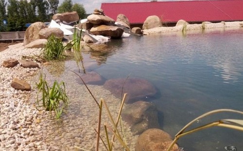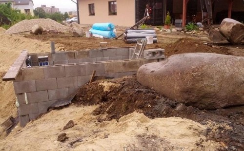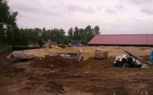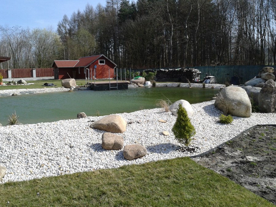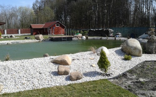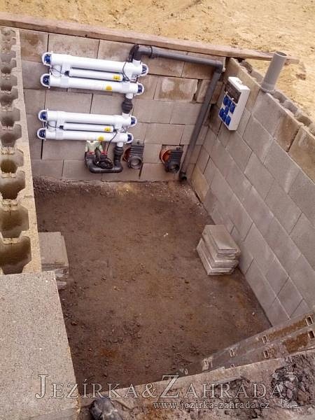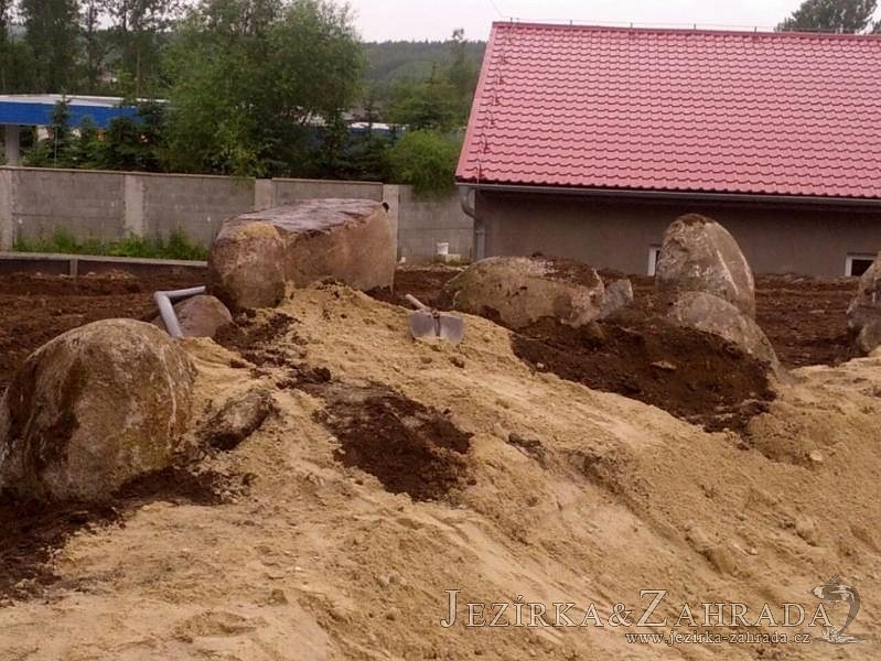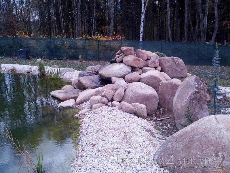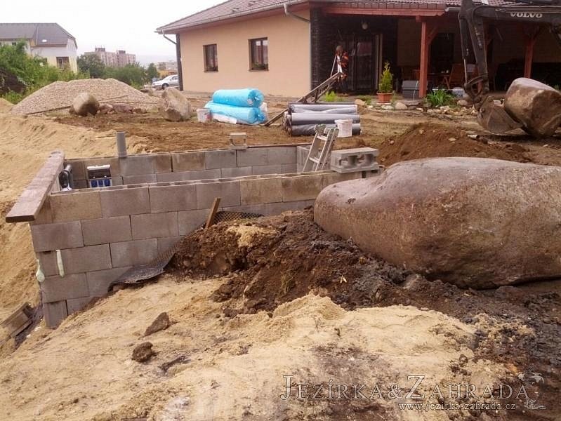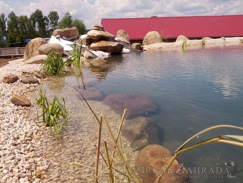 Pod naším technickým dozorem se začalo stavět okrasné jezírko v Sokolově. Nejprve se zakreslil tvar jezírka a technické místnosti, které se následně vybagrovali. Jezírko se vypískovalo, položilo se potrubí pro technologii - spodní vpusť-gule a do stěny technické místnosti fóliová příruba pro skimmer Oase Aquaskim Gravity a geotextílie 500g. Následně se svařila na míru jezírková fólie Fatra Aquaplast 805/V 1,5mm olivově zelená. Dodávaná technologie: biologicko-mechanický filtr Tripond Center-Vortex C115, 2x UV lampa TMC Pro Pond Advantage 110W, úsporné čerpadlo Oase Aquamax Gravity Eco 20000, vzduchovací čerpadlo Hailea HAP-80. Vytvořil se vodopád a celý obvod jezírka se dotvořil okrasným kačírkem, velkými kameny. Pro oddělení kačírku a okolní zatravněné plochy byl použit neviditelný obrubník.