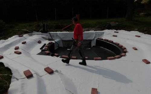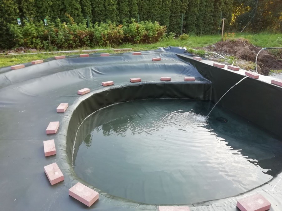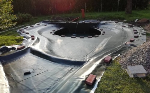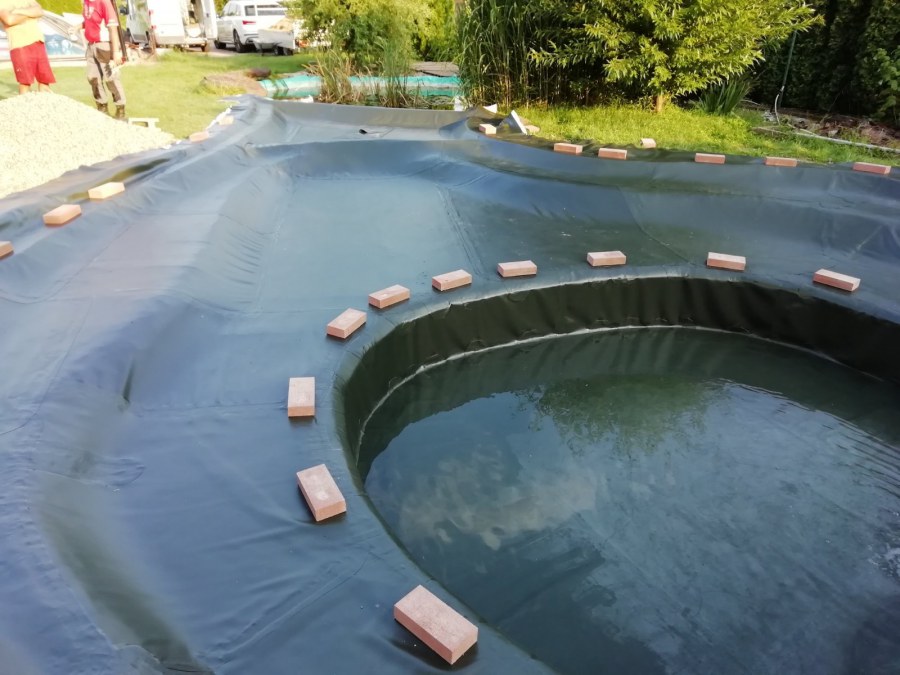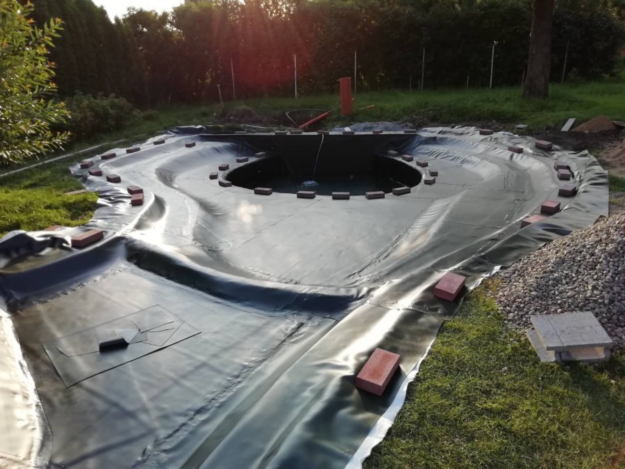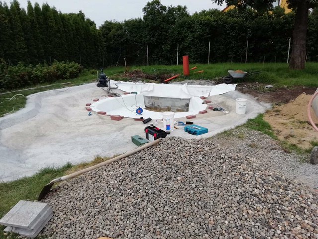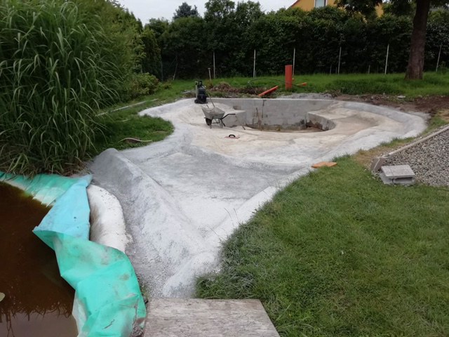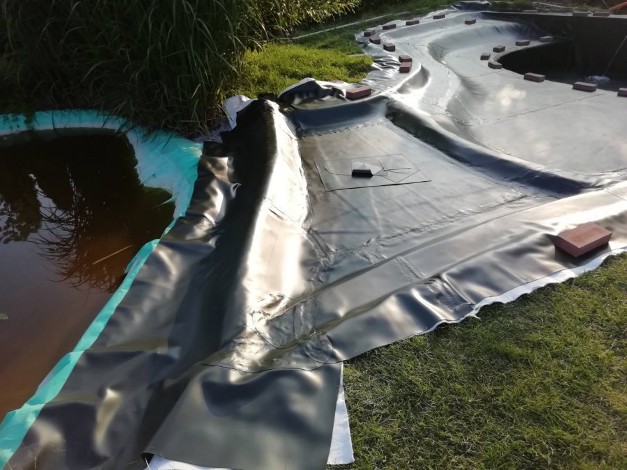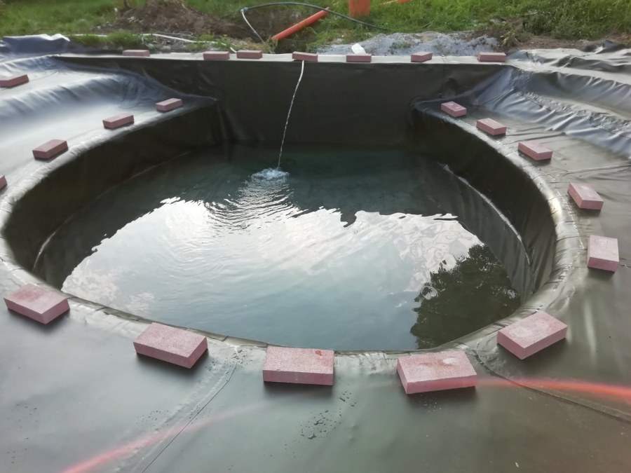 Po návštěvě naší prodejny se zákazník rozhodl vybudovat u domu okrasné jezírko. Netrvalo dlouho a kontaktoval nás s tím, že vykopal hrubý obrys jezírka. Spojili jsme se s ním tedy a radili mu jak postupovat dál. Jak uložit guly, natáhnout potrubí od guly k čerpadlové šachtě. Dle našich instrukcí ještě zpevnil hráz ztraceným bedněním a celé jezírko pokryl slabší vrstvou betonu. Poté přijeli naši technici a začali jezírko fóliovat. Nejprve natáhli geotextílii 500g, poté na hranu ztraceného bednění navrtali fóliové lišty a pak už pokládali jezírkovou fólii Fatra Aquaplast 805/V olivově zelenou přesně dle tvaru jezírka. Majitel jezírko napustil, obsah je cca 30m3 . Další fáze stavby jako je připojení technologie a usazení kamenů a květin bude probíhat v příštím roce 2022.