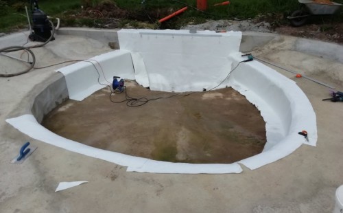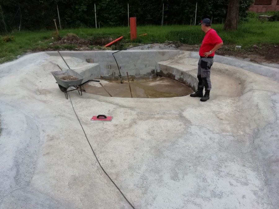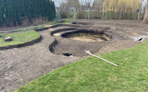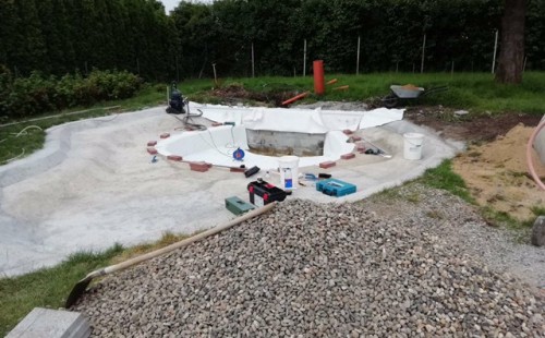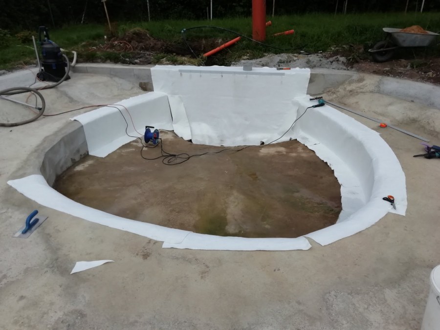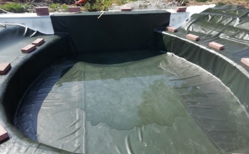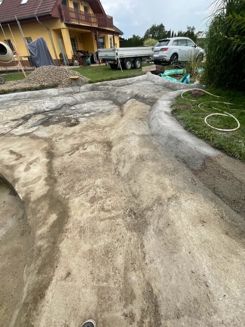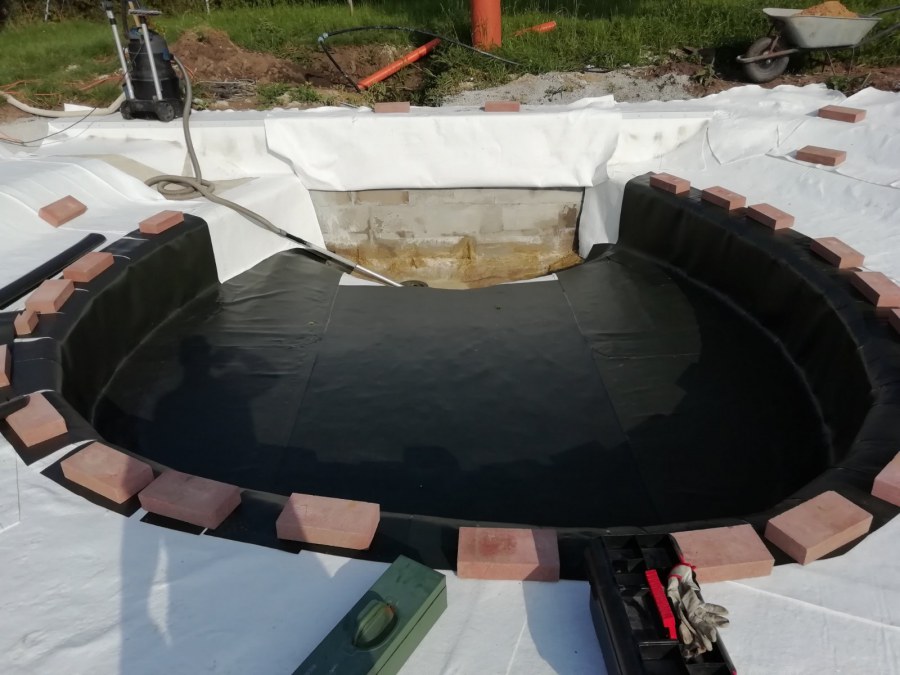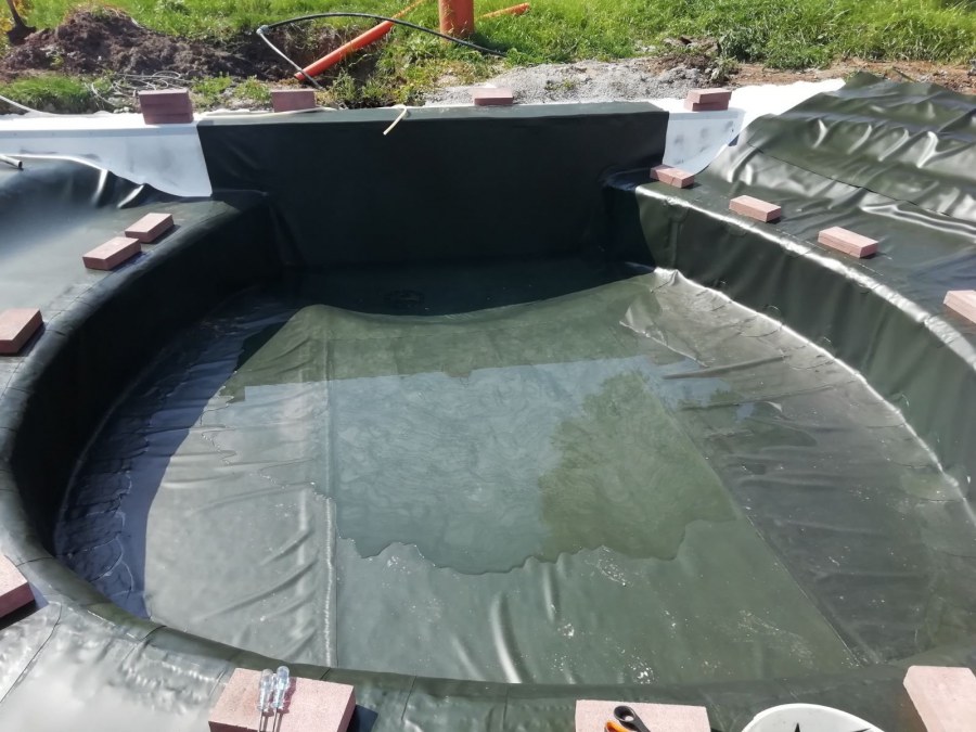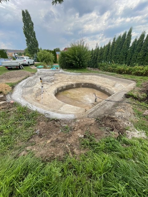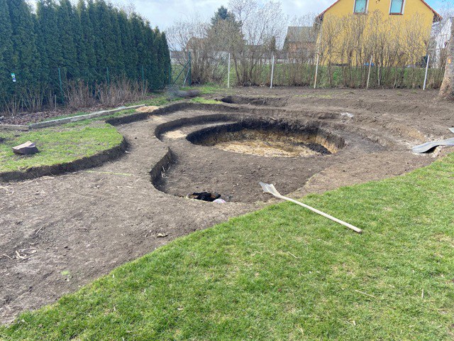 Po návštěvě naší prodejny se zákazník rozhodl vybudovat u domu okrasné jezírko. Netrvalo dlouho a kontaktoval nás s tím, že vykopal hrubý obrys jezírka. Spojili jsme se s ním tedy a radili mu jak postupovat dál. Jak uložit guly, natáhnout potrubí od guly k čerpadlové šachtě. Dle našich instrukcí ještě zpevnil hráz ztraceným bedněním a celé jezírko pokryl slabší vrstvou betonu. Poté přijeli naši technici a začali jezírko fóliovat. Nejprve natáhli geotextílii 500g, poté na hranu ztraceného bednění navrtali fóliové lišty a pak už pokládali jezírkovou fólii Fatra Aquaplast 805/V olivově zelenou přesně dle tvaru jezírka. Majitel jezírko napustil, obsah je cca 30m3 . Další fáze stavby jako je připojení technologie a usazení kamenů a květin bude probíhat v příštím roce 2022.