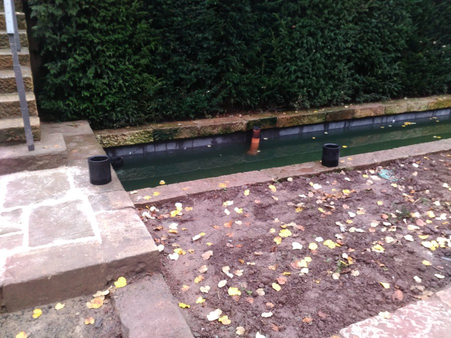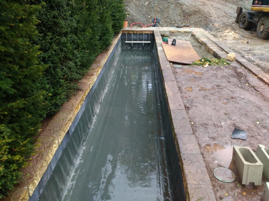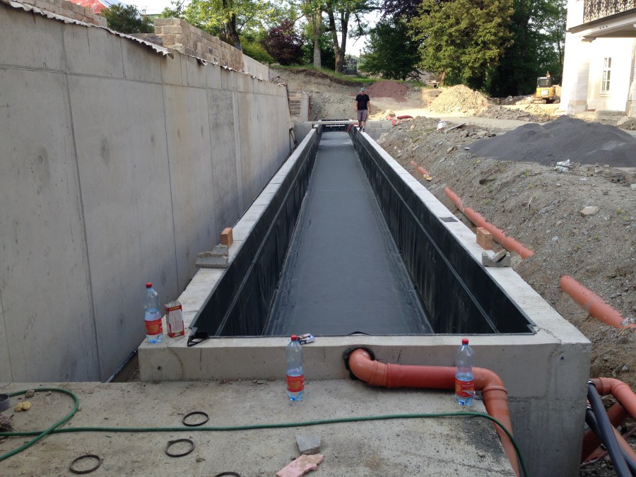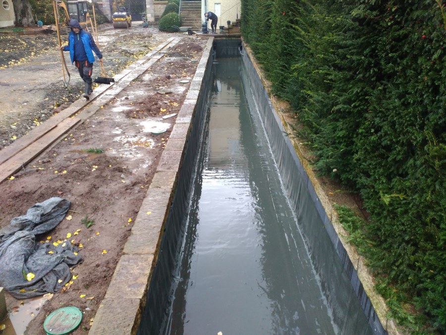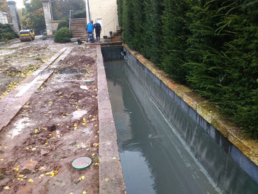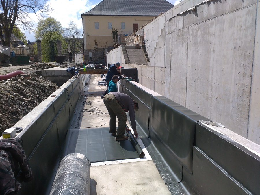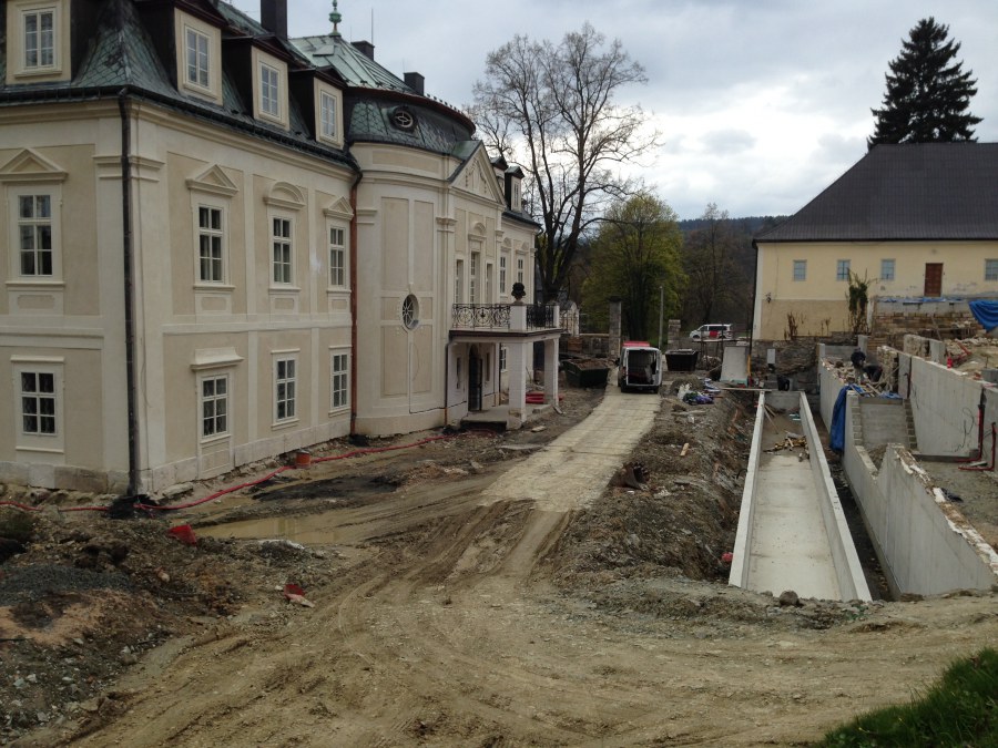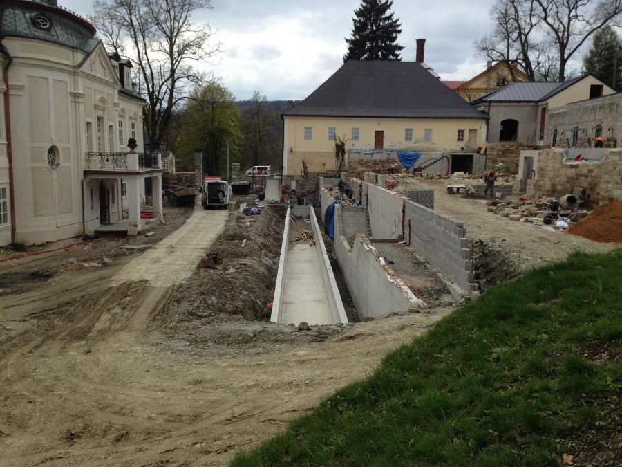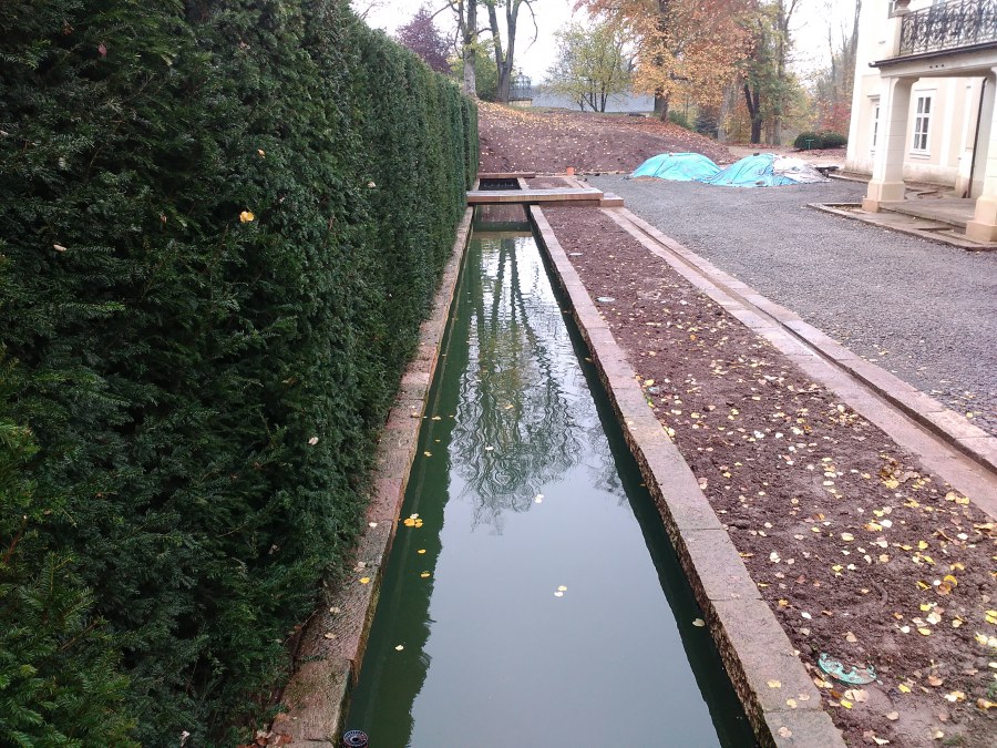 V roce 2019 jsme se zapojili do rekonstrukce malého zámečku. Náš úkol byl vystavět a zprovoznit vodní příkop u vchodu do zámku. Ze ztraceného bednění jsme vystavěli cca 40m dlouhé koryto 1m hluboké. Do stěn se vložilo několik fóliových přírub pro skimmery Oase Aquaskim Gravity a pro přítok vody, ten je vymyšlený tak, že se na stěnu napojí speciálně vyrobená nerezová tryska, která bude vhánět vodu do koryta. Před samotným foliováním se položila geotextílie 500g, na hrany se přivrtali speciální fóliové lišty, na které se poté začala navařovat jezírková fólie Fatra Aquaplast 805/V olivově zelená. Do malé technické místnosti pod schody se umístil na míru vyrobený filtr k němu se napojili 2 UV lampy TMC Pro Clear 110W a čerpadlo Oase AquaMax Eco Expert 21000. Hladinu vody hlídá automatické dopouštění Oase ProfiClear Guard.