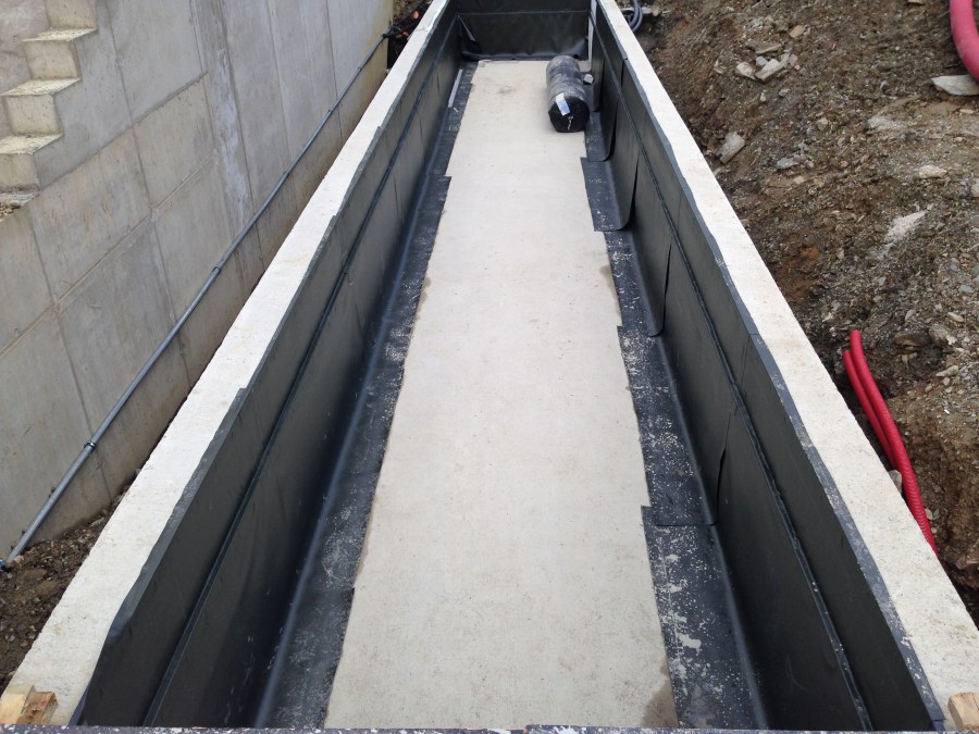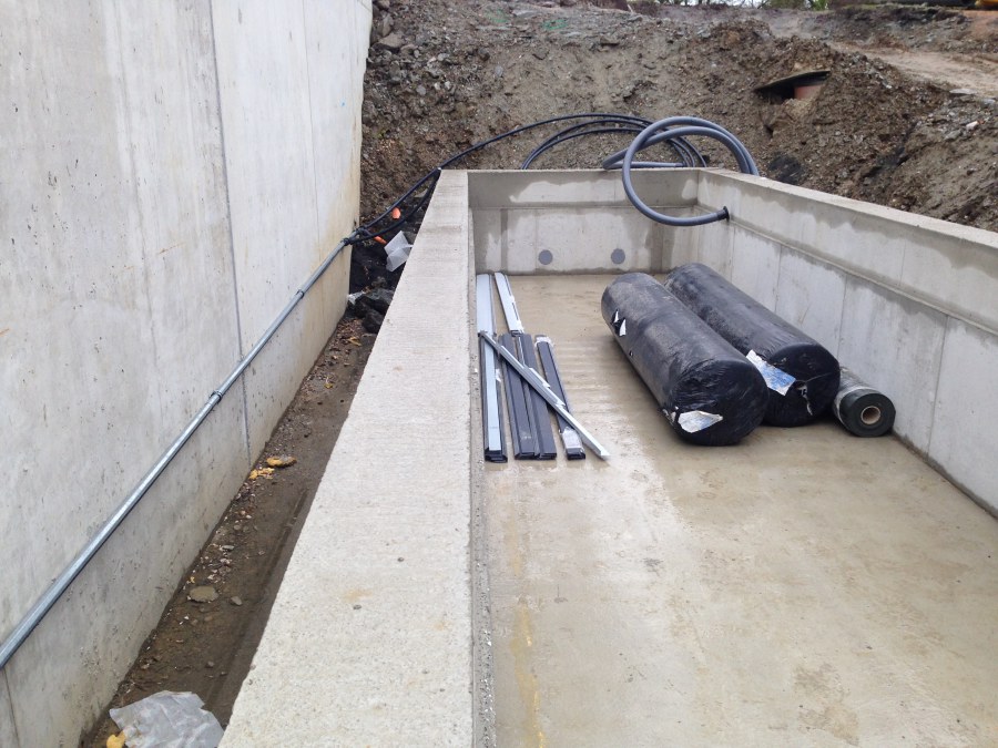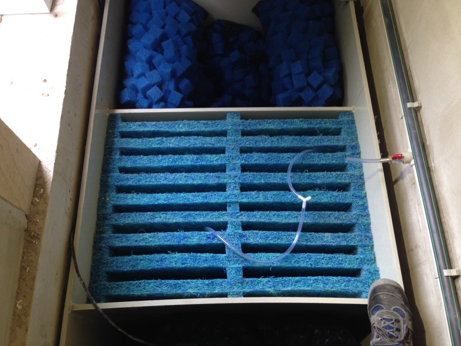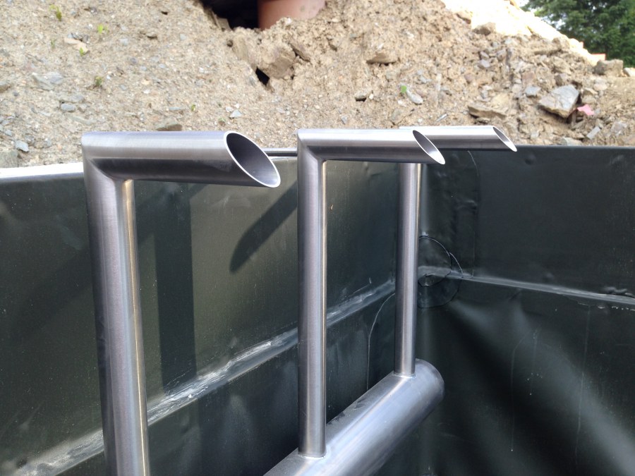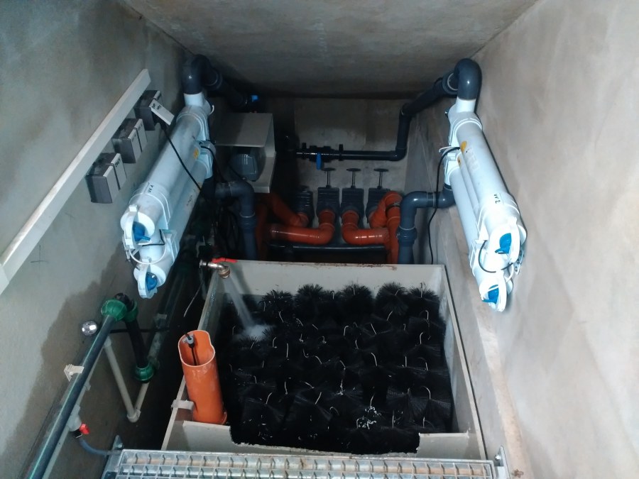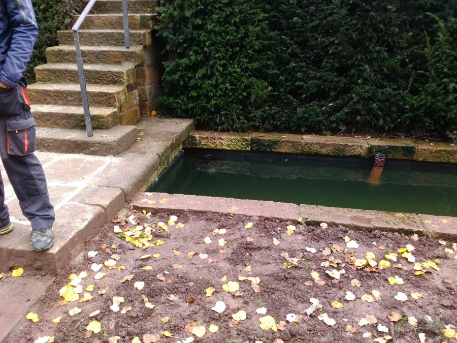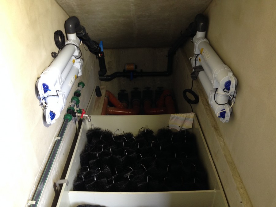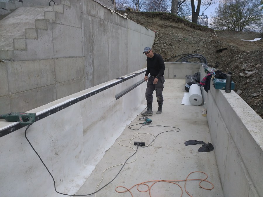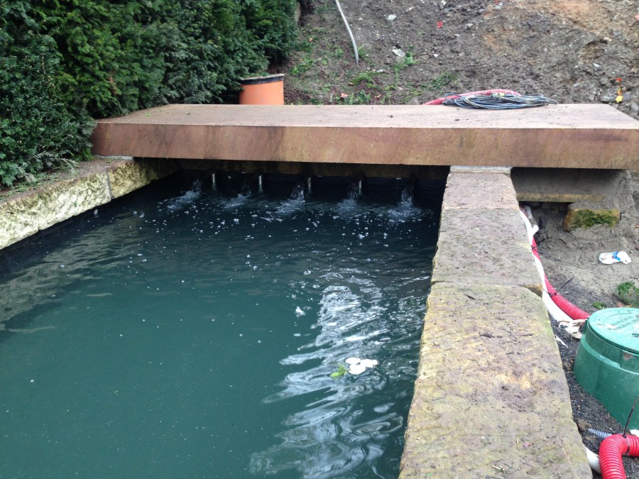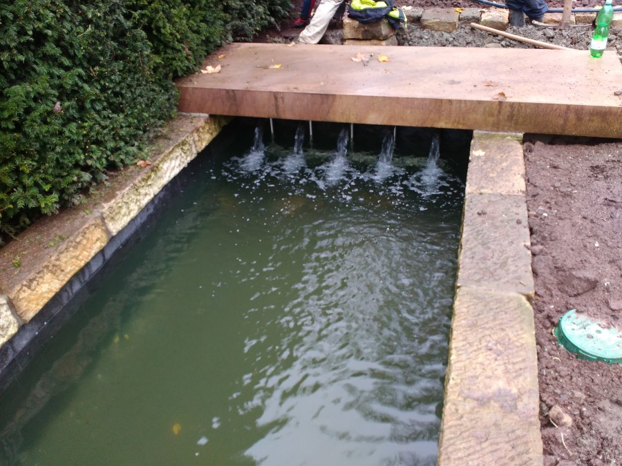 V roce 2019 jsme se zapojili do rekonstrukce malého zámečku. Náš úkol byl vystavět a zprovoznit vodní příkop u vchodu do zámku. Ze ztraceného bednění jsme vystavěli cca 40m dlouhé koryto 1m hluboké. Do stěn se vložilo několik fóliových přírub pro skimmery Oase Aquaskim Gravity a pro přítok vody, ten je vymyšlený tak, že se na stěnu napojí speciálně vyrobená nerezová tryska, která bude vhánět vodu do koryta. Před samotným foliováním se položila geotextílie 500g, na hrany se přivrtali speciální fóliové lišty, na které se poté začala navařovat jezírková fólie Fatra Aquaplast 805/V olivově zelená. Do malé technické místnosti pod schody se umístil na míru vyrobený filtr k němu se napojili 2 UV lampy TMC Pro Clear 110W a čerpadlo Oase AquaMax Eco Expert 21000. Hladinu vody hlídá automatické dopouštění Oase ProfiClear Guard.