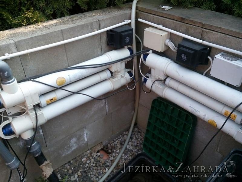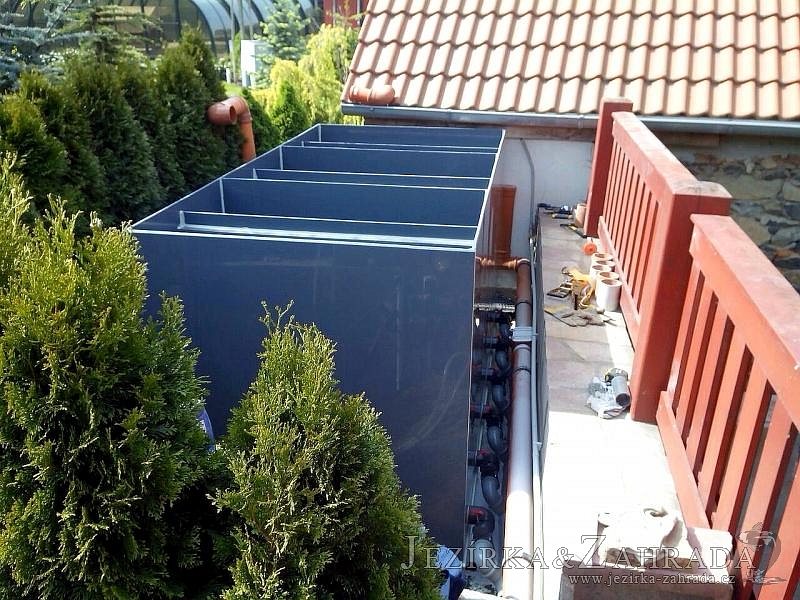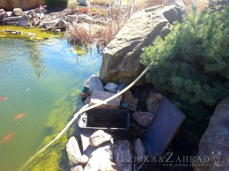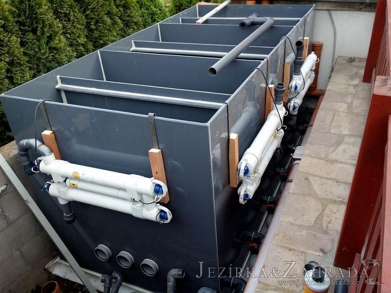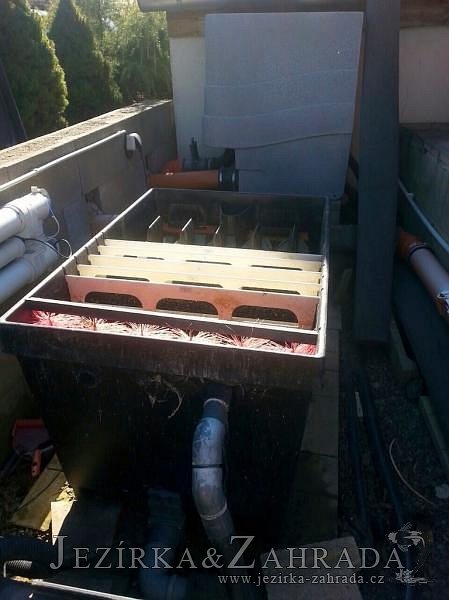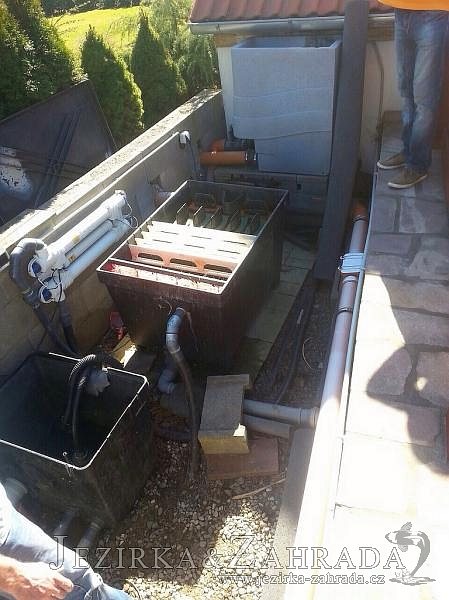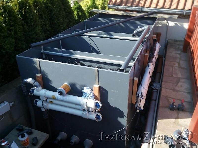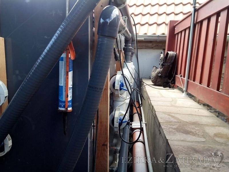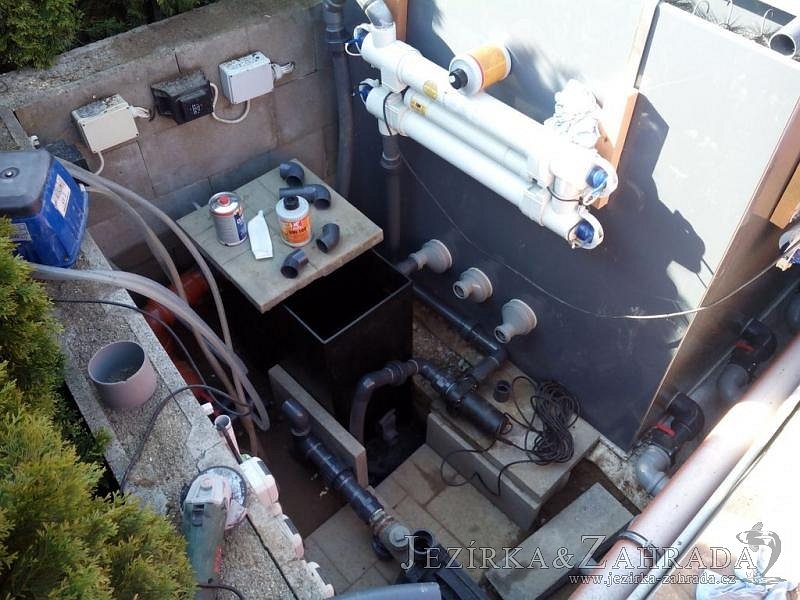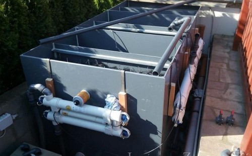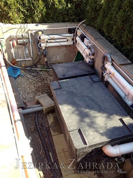Zákazník se rozhodl po letech neúspěšného bojování se špatně fungující technologií pro změnu, nechal si od nás navrhnout technologii na okrasné jezírko o velikosti 70m3. Muselo se přihlížet k již upravenému terénu, zvětšovala se a upravovala technická místnost. Protože se jednalo o nestandartní rozměry nechali jsme vyrobit filtr na míru o objemu 6,5m3, k němu jsme přidali 1x štěrbinový filtr Budget 2, 3x UV lampu TMC Pro Pond Advantage 110W (klient 2x již vlastnil) a 3x osvětlovací set Oase LunAgua 3 Led set. Ze stávající technologie byl zachován skimmer Oase BioSys Skimmer+ a plovoucí skimmer Messner schwimmskimmer 200. Dle klientovo informací bylo znát zlepšení téměř po několika dnech.