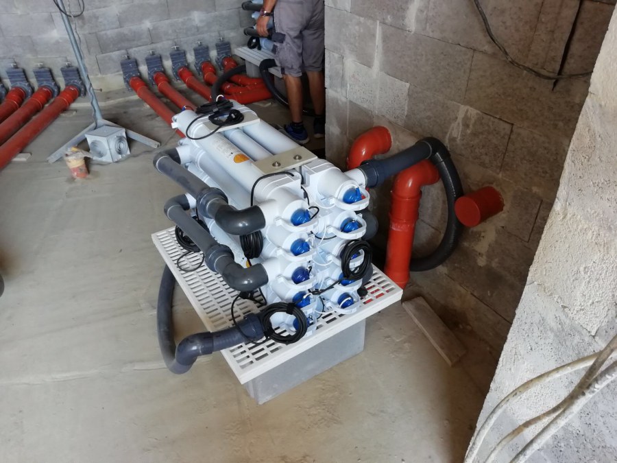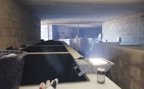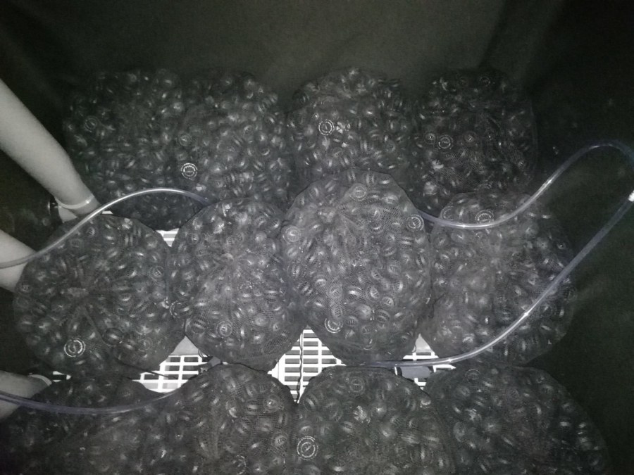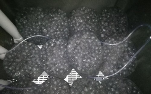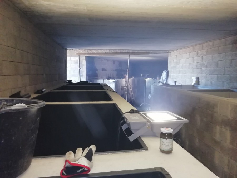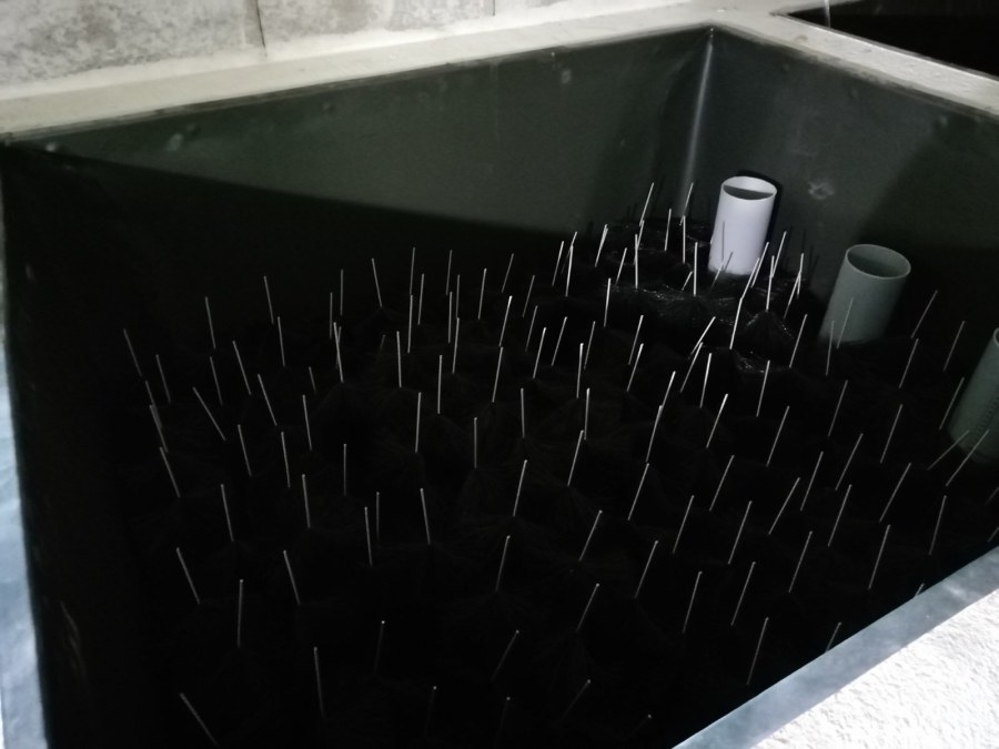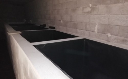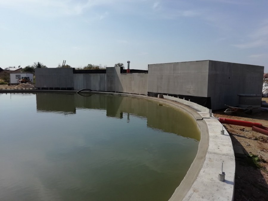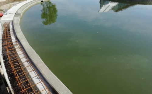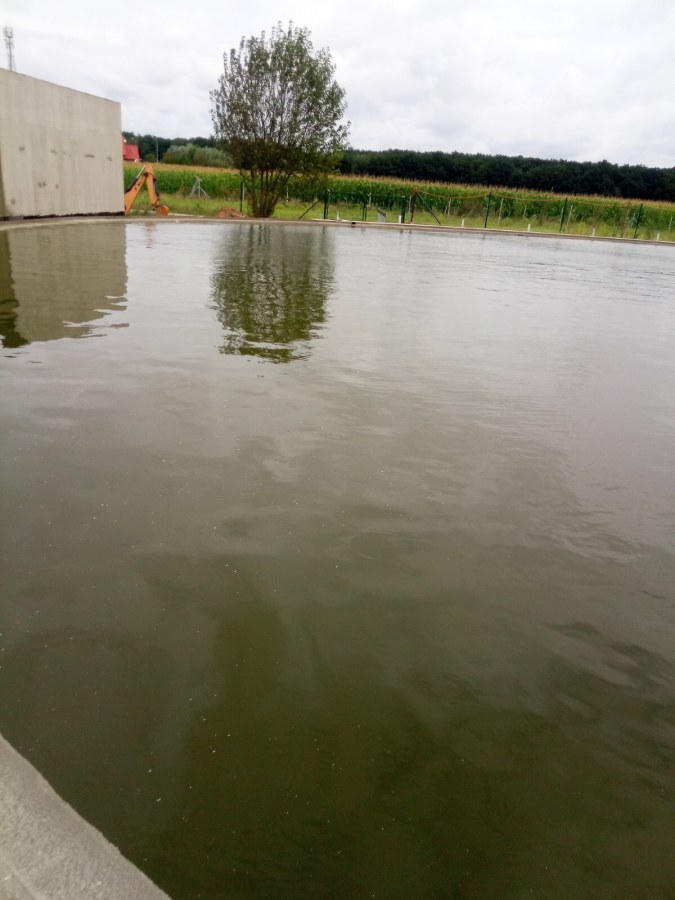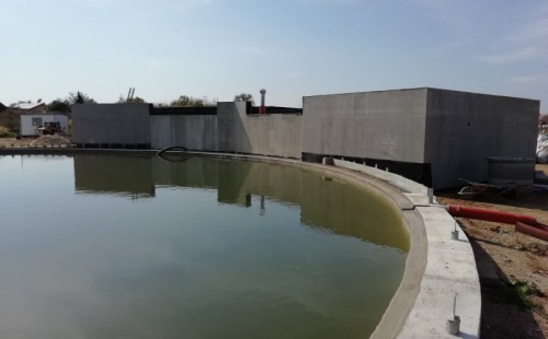 Od začátku roku jsme žili přípravou stavby technického zázemí pro vodní nádrž u novostavby domu ve Staročernsku. Vodní stavbu realizoval investor na místě sám se stavební firmou. Nádrž nemá vyfóliované dno, ale je opatřeno speciálním izolačním nátěrem. Náš úkol byl vytvořit fungující filtrační zázemí pro 1,4tis.m3 vody. Firma postavila dle našeho návrhu místnost, která je rozdělena na 2 sekce po 8 a 9 volně stojících kójích. Obsah filtračních kójí je celkem 40m3. Naši technici měli za úkol kóje vyfóliovat a naplnit filtračními médii. Nejdříve do stěn zasadili fóliové příruby. Do kóje položili geotextílii 500g, na hrany kójí přivrtali speciální lišty a na to následně navařili fólii Fatra Aquaplast 805/V. Na dno kójí vložili silné filtrační rošty a na to se začali vyskládávat různá filtrační média (kartáče, pytle s biokuličkami a kostkami z bioakvacitu). K médiím je rozveden vzduch v PPR, pomocí kompresorů Jebao PA-200 (vzduch v médiích podporuje práci bakterií a tím je efekt čištění vody větší). Vodu do nádrží přivádí 4 silná čerpadla Oase AquaMax Eco Titanium 51000. Proti zelenání vody jsme připojili do systému 4 sestavy UV lamp TMC Pro Pond Advantage 550W.
