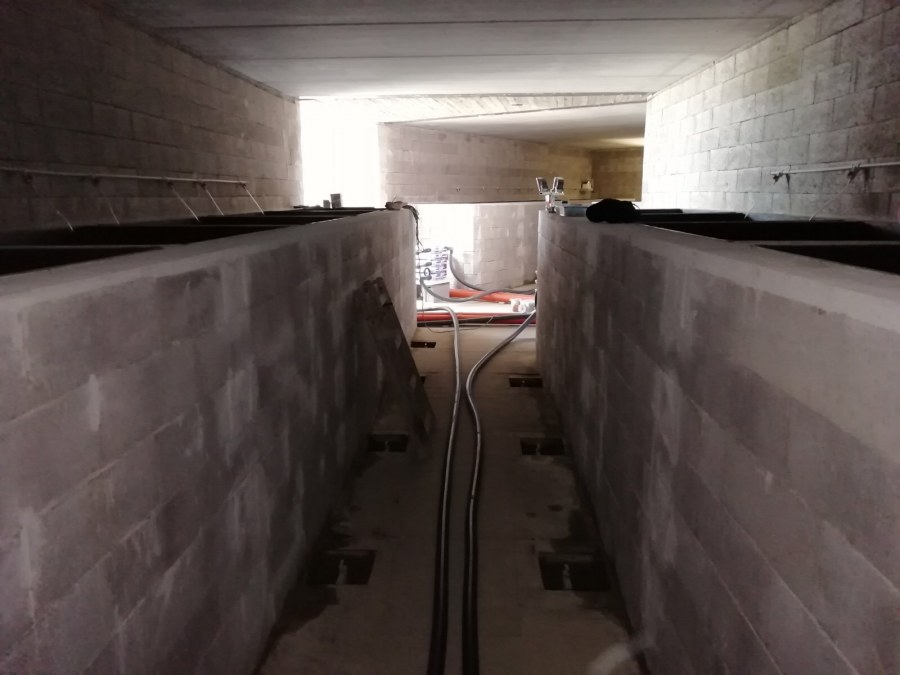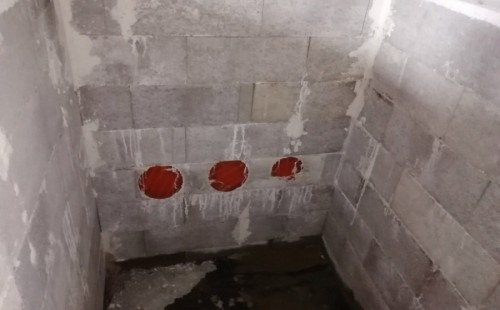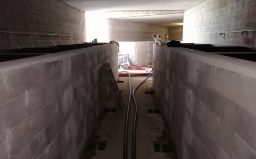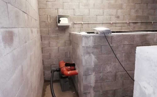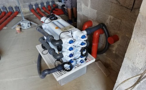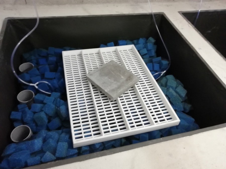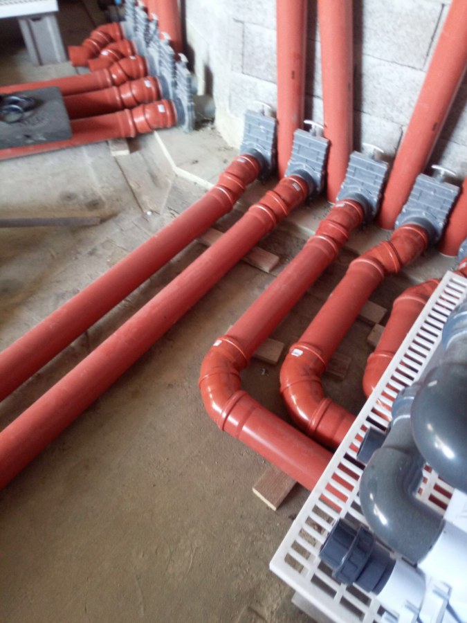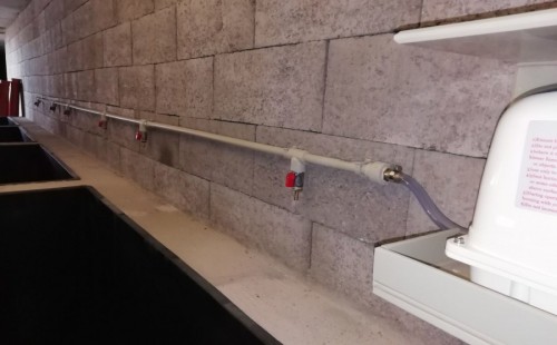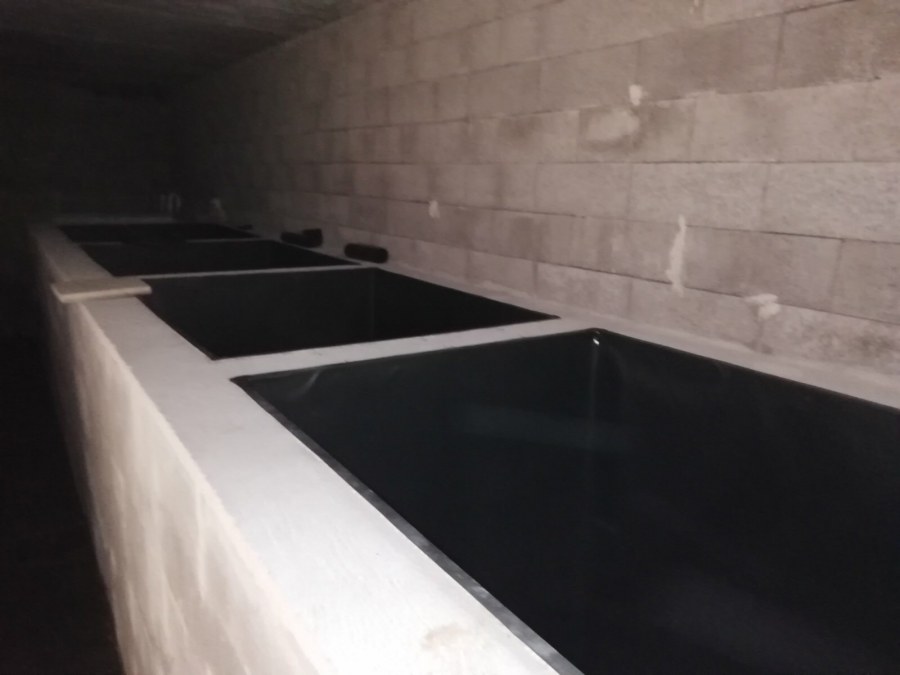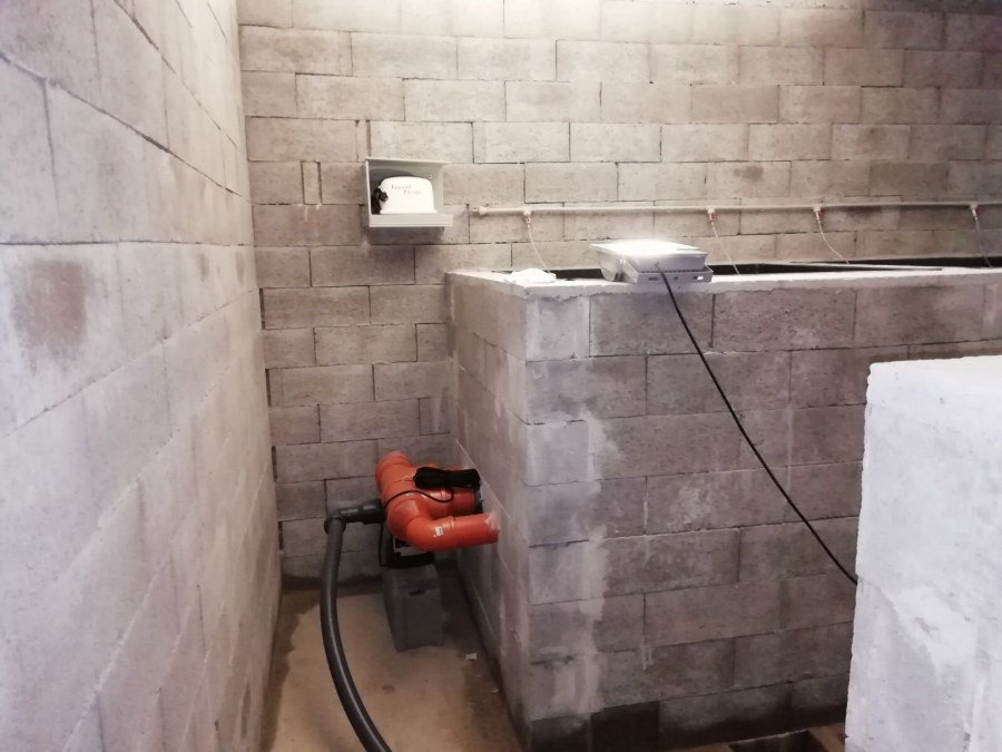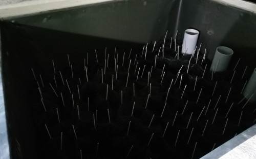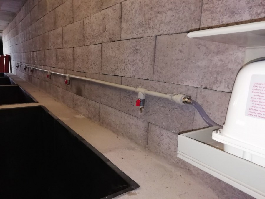 Od začátku roku jsme žili přípravou stavby technického zázemí pro vodní nádrž u novostavby domu ve Staročernsku. Vodní stavbu realizoval investor na místě sám se stavební firmou. Nádrž nemá vyfóliované dno, ale je opatřeno speciálním izolačním nátěrem. Náš úkol byl vytvořit fungující filtrační zázemí pro 1,4tis.m3 vody. Firma postavila dle našeho návrhu místnost, která je rozdělena na 2 sekce po 8 a 9 volně stojících kójích. Obsah filtračních kójí je celkem 40m3. Naši technici měli za úkol kóje vyfóliovat a naplnit filtračními médii. Nejdříve do stěn zasadili fóliové příruby. Do kóje položili geotextílii 500g, na hrany kójí přivrtali speciální lišty a na to následně navařili fólii Fatra Aquaplast 805/V. Na dno kójí vložili silné filtrační rošty a na to se začali vyskládávat různá filtrační média (kartáče, pytle s biokuličkami a kostkami z bioakvacitu). K médiím je rozveden vzduch v PPR, pomocí kompresorů Jebao PA-200 (vzduch v médiích podporuje práci bakterií a tím je efekt čištění vody větší). Vodu do nádrží přivádí 4 silná čerpadla Oase AquaMax Eco Titanium 51000. Proti zelenání vody jsme připojili do systému 4 sestavy UV lamp TMC Pro Pond Advantage 550W.