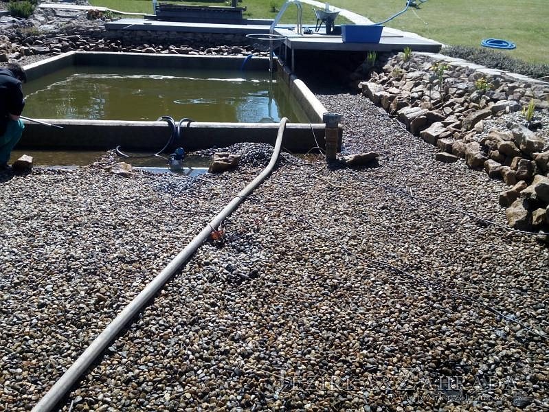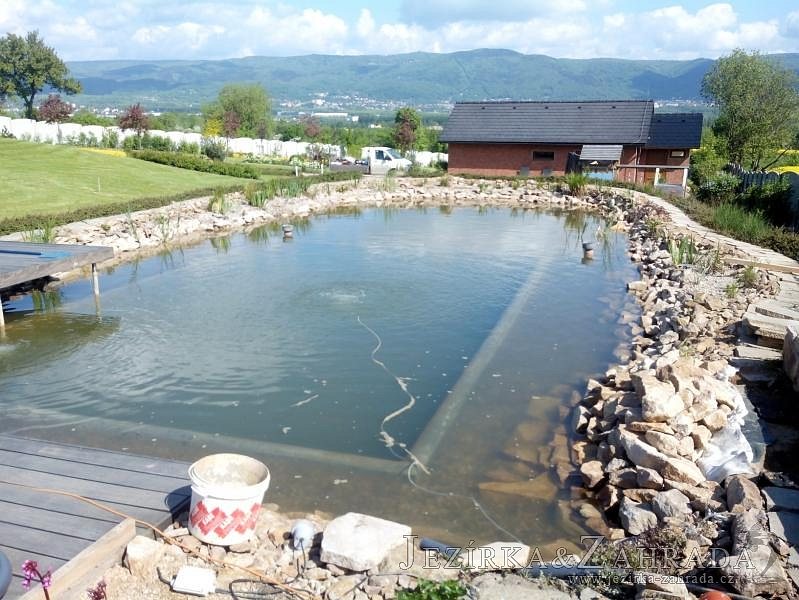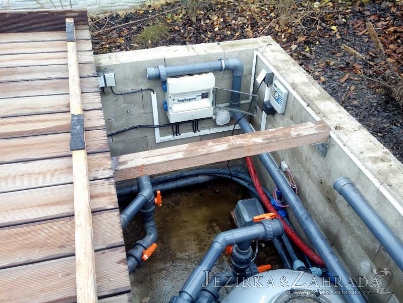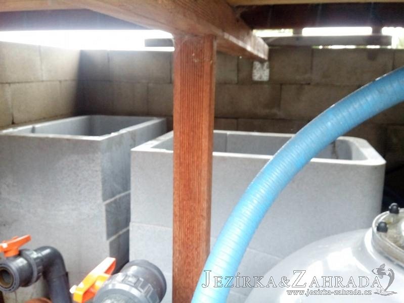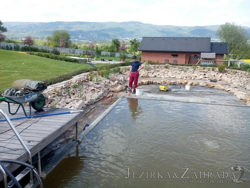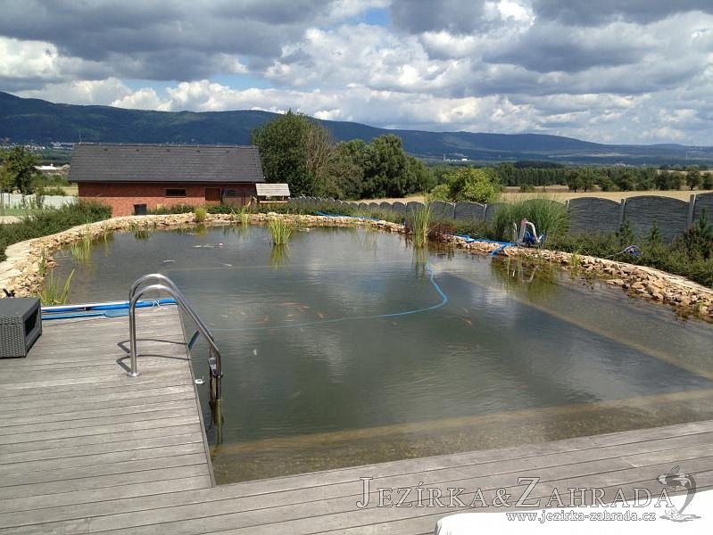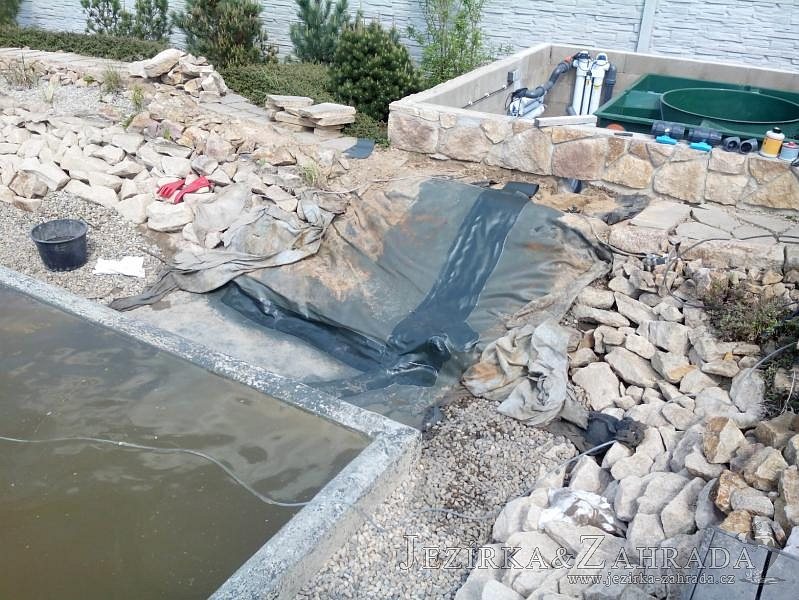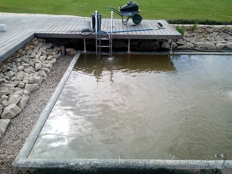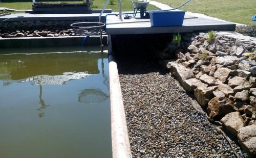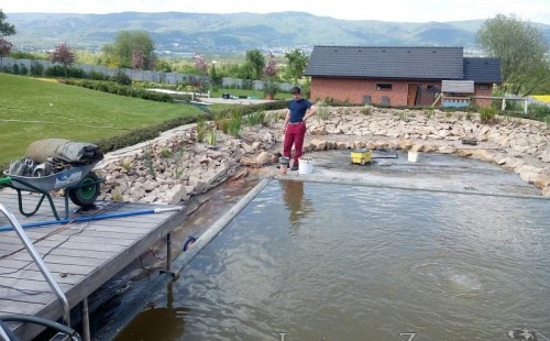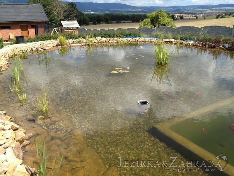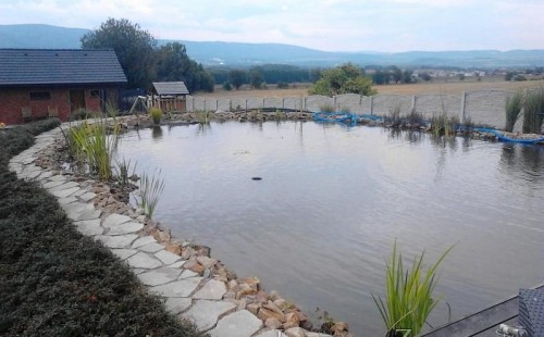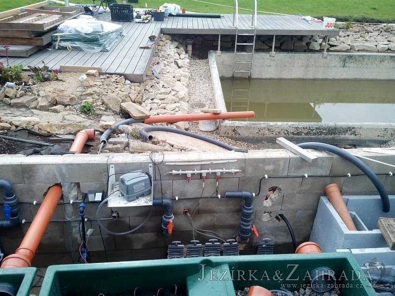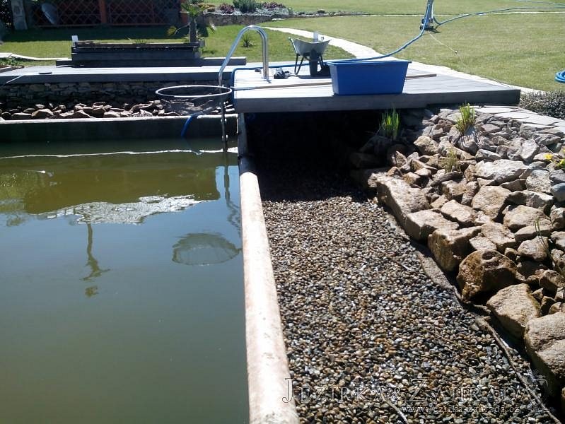 Obrátil se na nás klient, který již několik let neúspěšně "bojoval" s nefunkční technologií. I když ho původní technologie stála nemalé prostředky, byl nucen stávající systém předělat. Bohužel je zde i zbytečně velká mělká zóna, ale ta se ponechala v původním stavu. Nejprve se odlovily ryby, odkalilo a vypustilo se celé jezírko, demontovala se stávající technologie. Došlo k i částečné úpravě, narušení dna, položení potrubí a spodních gulí. Došlo k zadělání trubek a vrácení fólie do původního stavu. Musela se zvětšovat technická místnost, která byla nedostačující pro naši technologii. Pro toto koupací jezírko bylo navrženo: 2x biologicko-mechanický filtr Tripond Center-Vortex C115, 2x UV lampa TMC Pro Pond Advantage 110W + 2x UV lampa TMC Pro Pond Advantage 110W ze stávajícího systému a 2x štěrbinový předfiltr, čerpadla AquaForte O-series 16000 a Jebao ECO-AMP 16000, 2x gula dnová výpusť 110mm, rozvod vzduchu v PPR. Díky nové technologii se zákazník mohl začít těšit z krásného čistého jezírka.