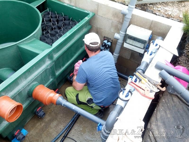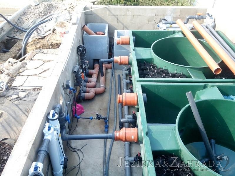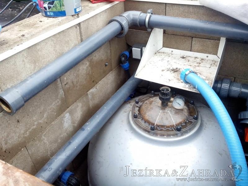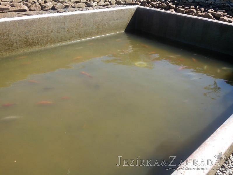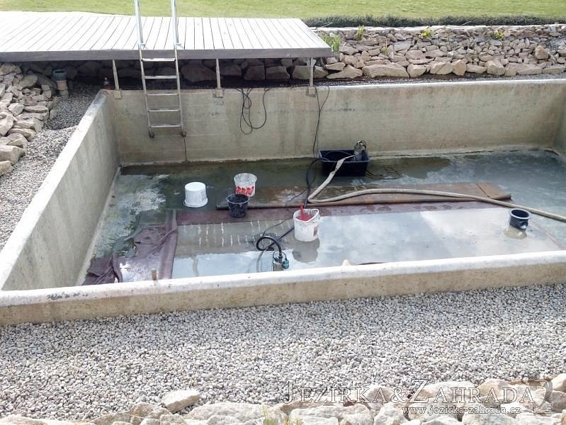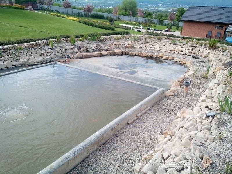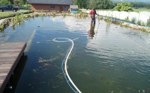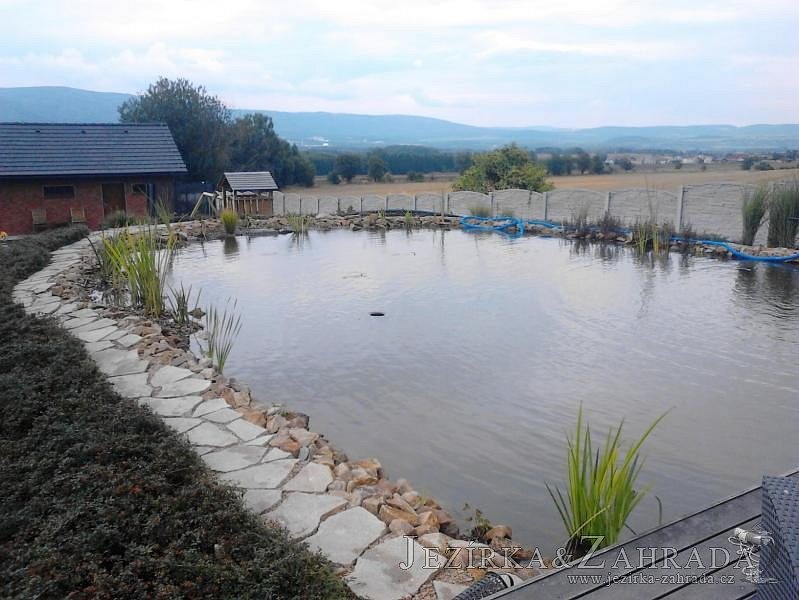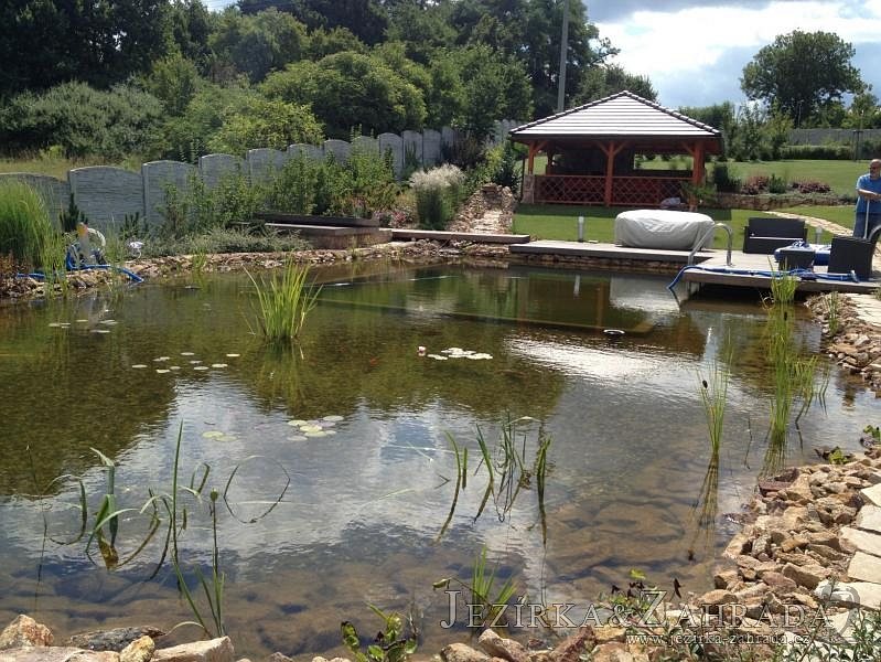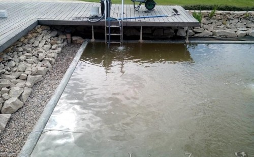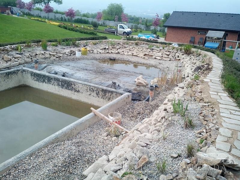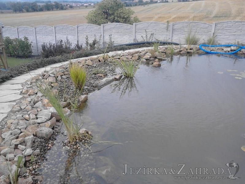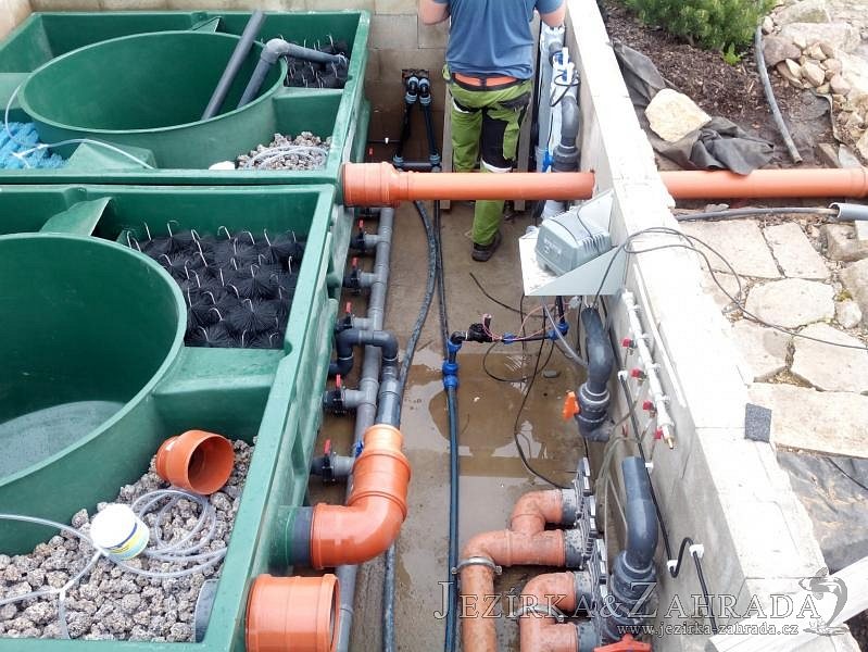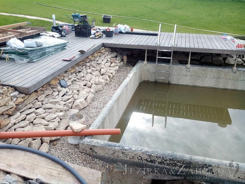 Obrátil se na nás klient, který již několik let neúspěšně "bojoval" s nefunkční technologií. I když ho původní technologie stála nemalé prostředky, byl nucen stávající systém předělat. Bohužel je zde i zbytečně velká mělká zóna, ale ta se ponechala v původním stavu. Nejprve se odlovily ryby, odkalilo a vypustilo se celé jezírko, demontovala se stávající technologie. Došlo k i částečné úpravě, narušení dna, položení potrubí a spodních gulí. Došlo k zadělání trubek a vrácení fólie do původního stavu. Musela se zvětšovat technická místnost, která byla nedostačující pro naši technologii. Pro toto koupací jezírko bylo navrženo: 2x biologicko-mechanický filtr Tripond Center-Vortex C115, 2x UV lampa TMC Pro Pond Advantage 110W + 2x UV lampa TMC Pro Pond Advantage 110W ze stávajícího systému a 2x štěrbinový předfiltr, čerpadla AquaForte O-series 16000 a Jebao ECO-AMP 16000, 2x gula dnová výpusť 110mm, rozvod vzduchu v PPR. Díky nové technologii se zákazník mohl začít těšit z krásného čistého jezírka.
