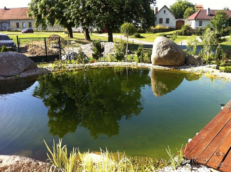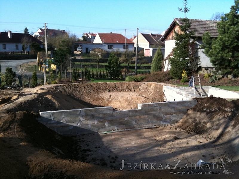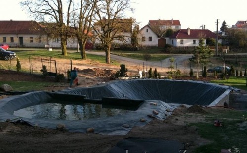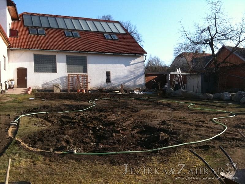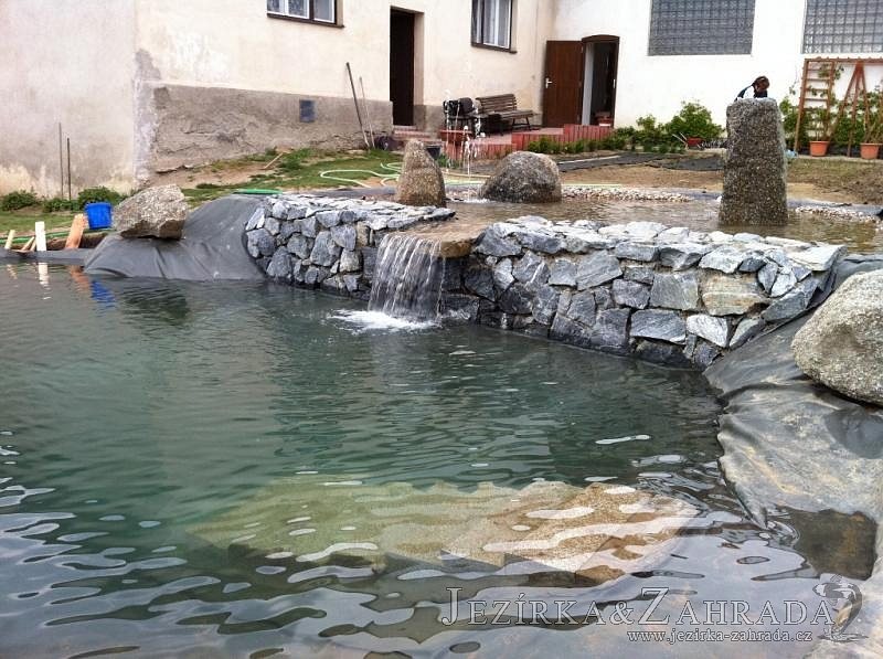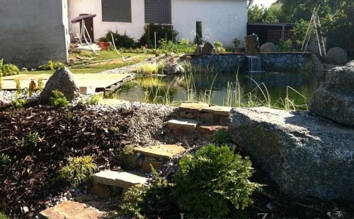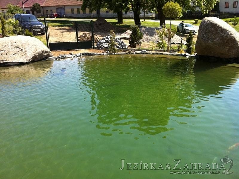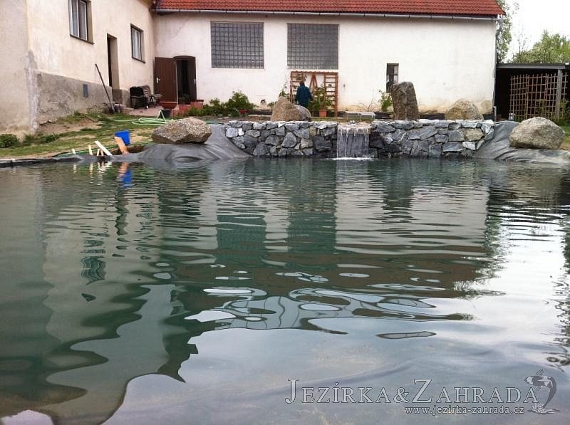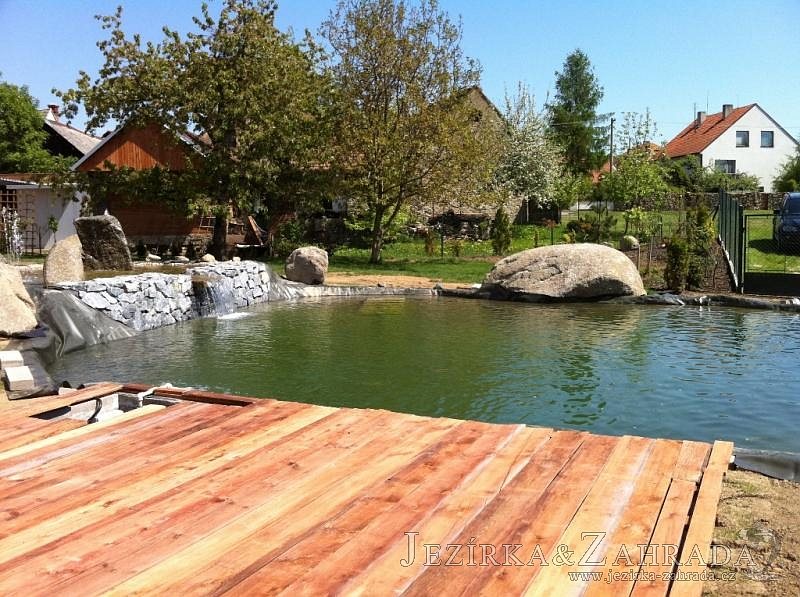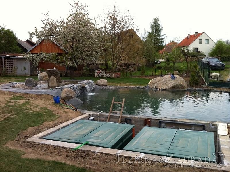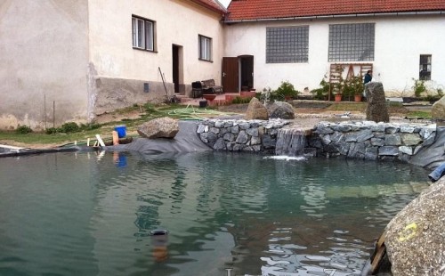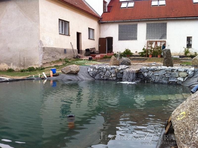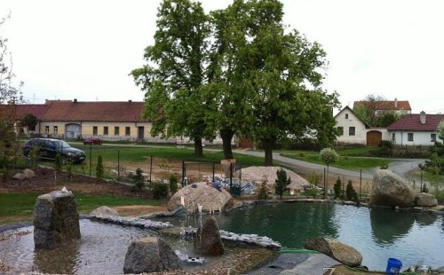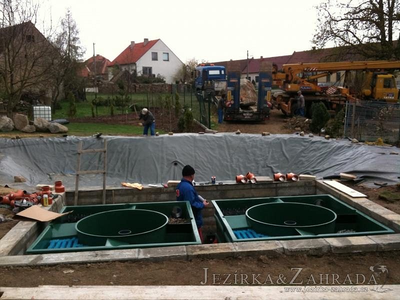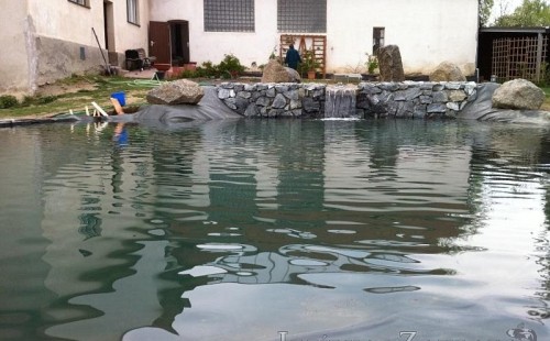 Stavba velmi propracovaného moderního koupacího jezírka o velikosti cca 110m3, kde bude použit 2x mechanicko-biologický filtr Tripond Center-Vortex C115, 2x UV lampa TMC Pro Pond Advantage 110W, 2x čerpadlo Messner eco 20000l/hod, 2x vzduchovací motor Resun PG 100. Zapojení technologie gravitačně 2x trubkový skimmer Oase AquaSkim Gravity, 2x gule -dnová vpusť 110mm. Jezírko bylo stavěno ve velmi svažitém terénu. Po dohodě s investorem jsme se rozhodli, že celé jezírko bude rozděleno na dvě části s rozdílnými hladinami. Vrchní jezírko bude mělká zóna s kačírkem a vodními rostlinami, kde přepadem bude přebytečná voda protékat do hluboké níže posazené koupací části. Technologická místnost bude ukryta pod velmi rozlehlou terasou s hydraulickým otvíráním, která bude zároveň sloužit jako odpočinková zóna v těsné blízkosti koupací části se vstupem do vody. Další atrakce: fontána Oase Water Quintet s dálkovým ovladačem. Kamenná skála s jezem mezi vrchní mělkou zónou a spodní koupací zónou. Dále bylo navrženo automatické dopouštění vody zn. Belimo, velmi kvalitní ohřev vody z vrtu a jiné vymoženosti.