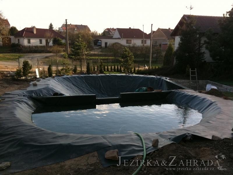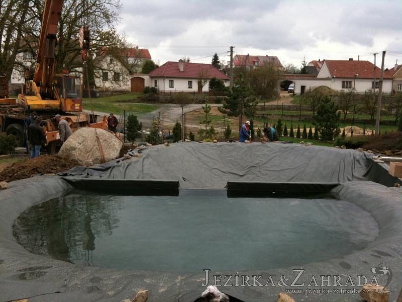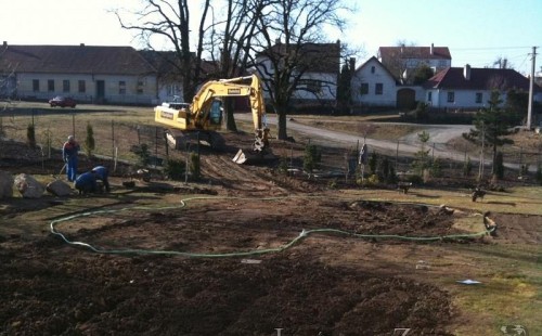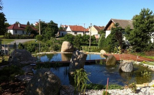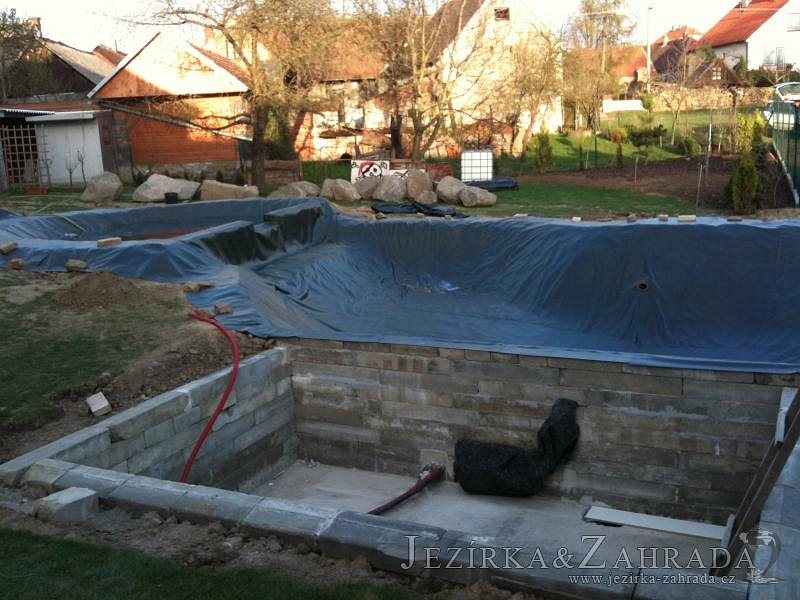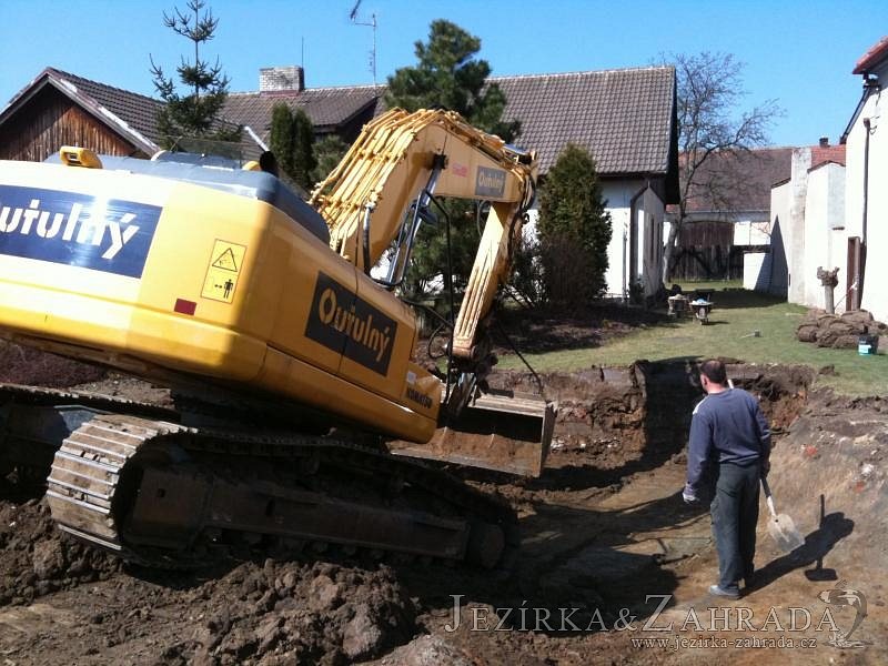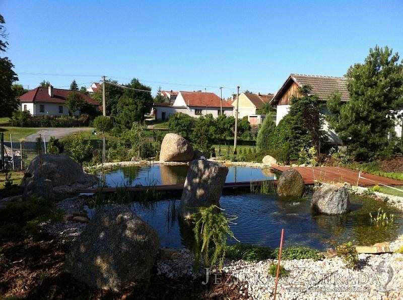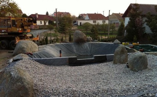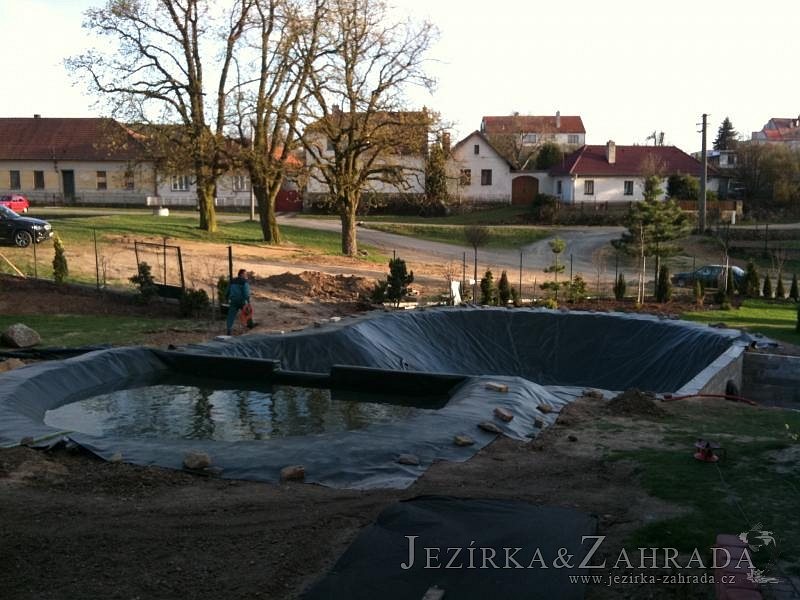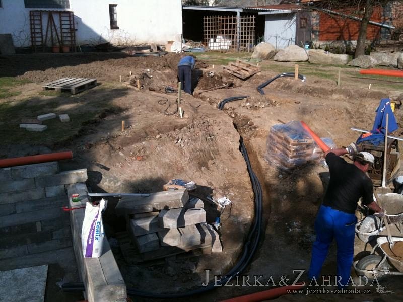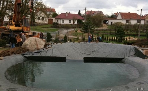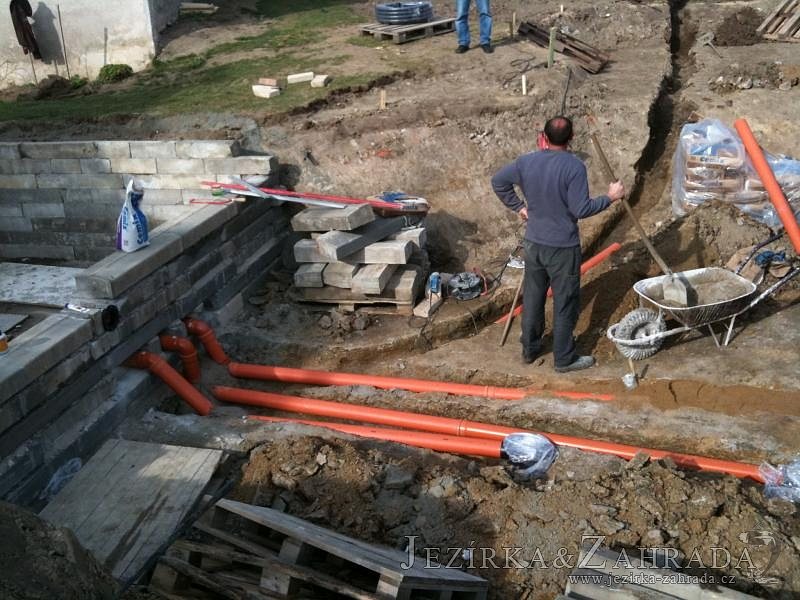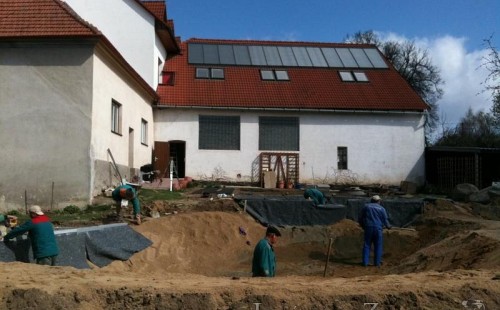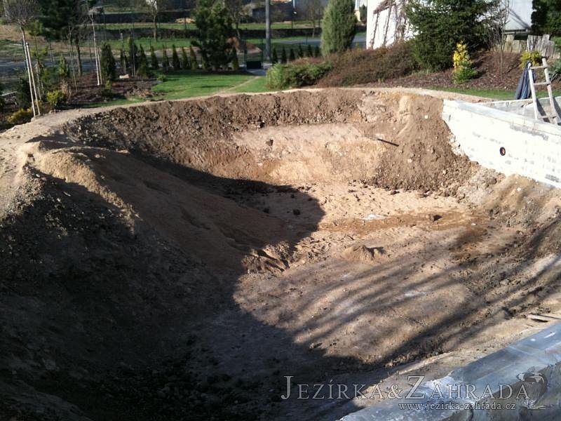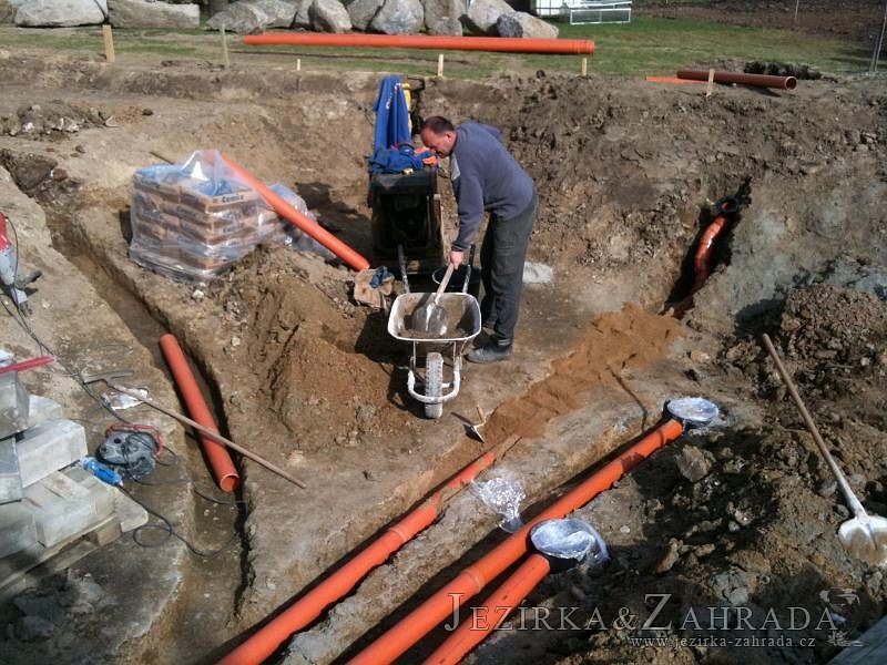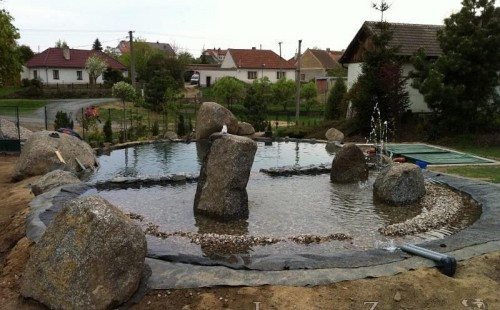 Stavba velmi propracovaného moderního koupacího jezírka o velikosti cca 110m3, kde bude použit 2x mechanicko-biologický filtr Tripond Center-Vortex C115, 2x UV lampa TMC Pro Pond Advantage 110W, 2x čerpadlo Messner eco 20000l/hod, 2x vzduchovací motor Resun PG 100. Zapojení technologie gravitačně 2x trubkový skimmer Oase AquaSkim Gravity, 2x gule -dnová vpusť 110mm. Jezírko bylo stavěno ve velmi svažitém terénu. Po dohodě s investorem jsme se rozhodli, že celé jezírko bude rozděleno na dvě části s rozdílnými hladinami. Vrchní jezírko bude mělká zóna s kačírkem a vodními rostlinami, kde přepadem bude přebytečná voda protékat do hluboké níže posazené koupací části. Technologická místnost bude ukryta pod velmi rozlehlou terasou s hydraulickým otvíráním, která bude zároveň sloužit jako odpočinková zóna v těsné blízkosti koupací části se vstupem do vody. Další atrakce: fontána Oase Water Quintet s dálkovým ovladačem. Kamenná skála s jezem mezi vrchní mělkou zónou a spodní koupací zónou. Dále bylo navrženo automatické dopouštění vody zn. Belimo, velmi kvalitní ohřev vody z vrtu a jiné vymoženosti.
