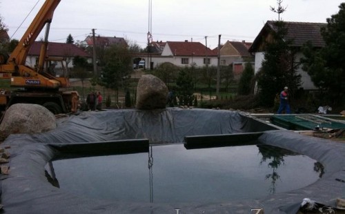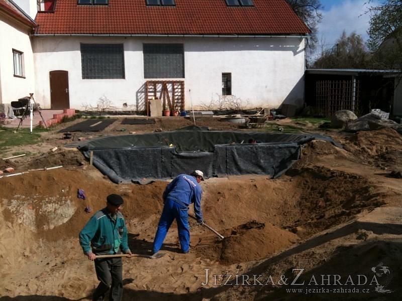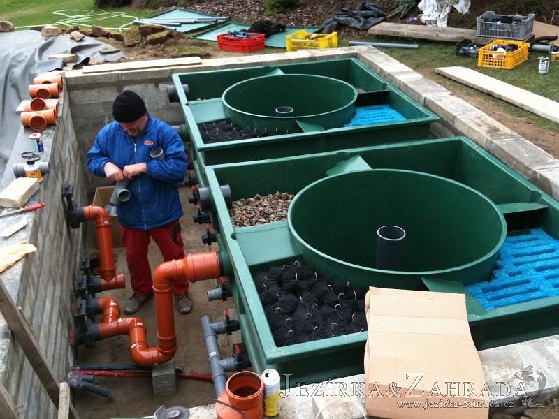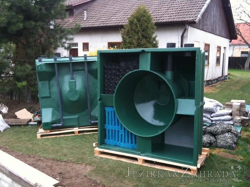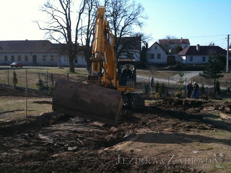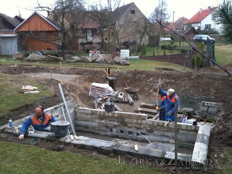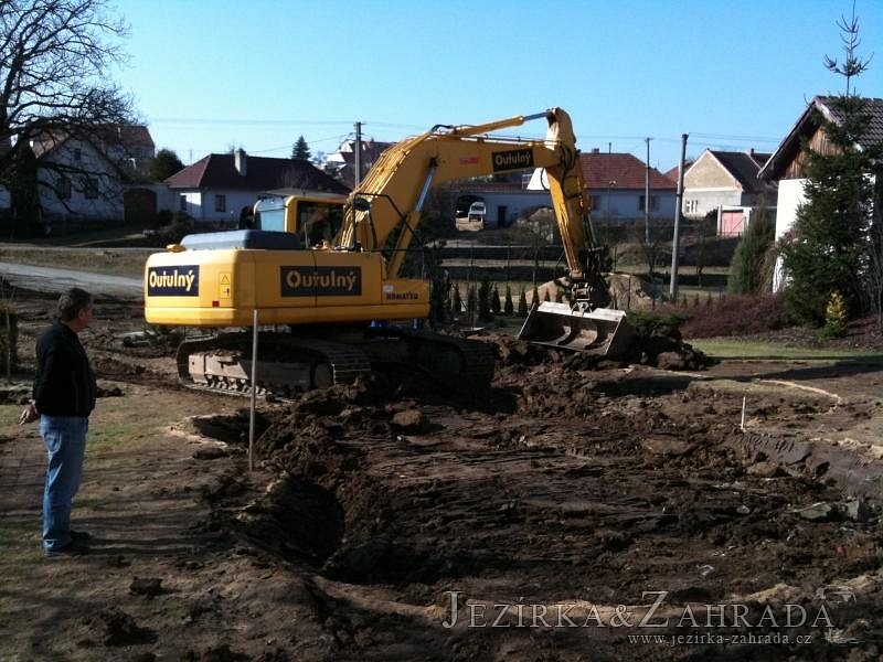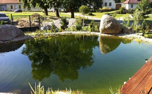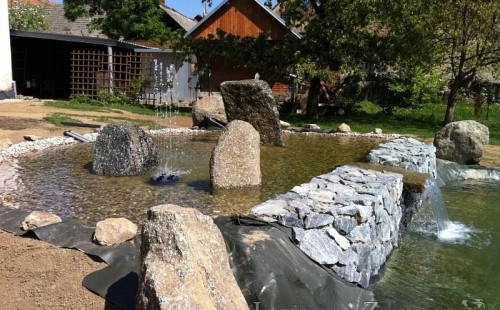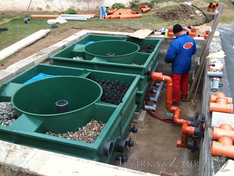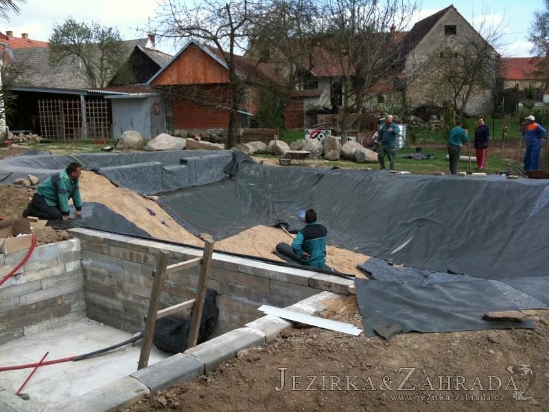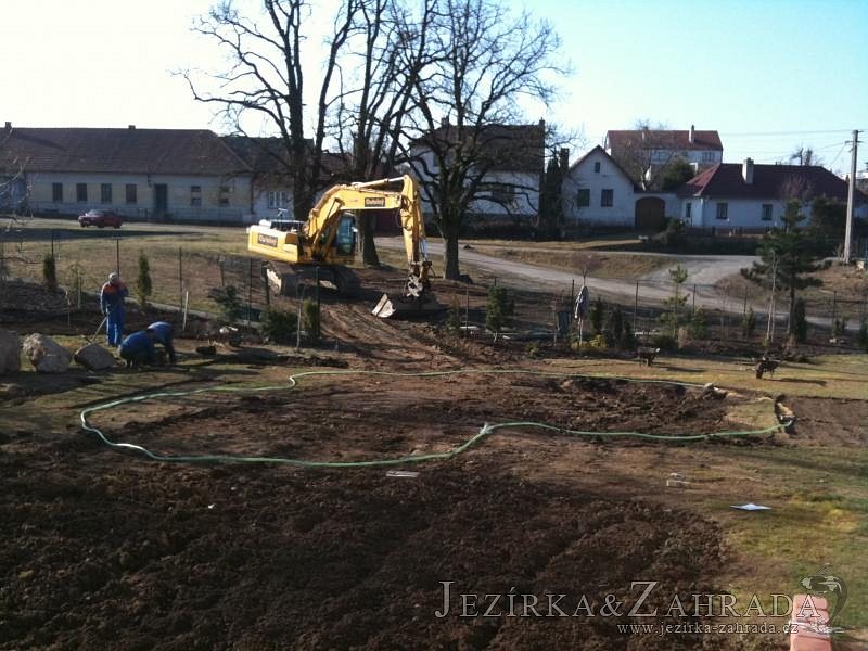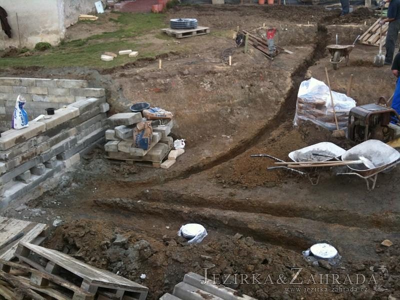 Stavba velmi propracovaného moderního koupacího jezírka o velikosti cca 110m3, kde bude použit 2x mechanicko-biologický filtr Tripond Center-Vortex C115, 2x UV lampa TMC Pro Pond Advantage 110W, 2x čerpadlo Messner eco 20000l/hod, 2x vzduchovací motor Resun PG 100. Zapojení technologie gravitačně 2x trubkový skimmer Oase AquaSkim Gravity, 2x gule -dnová vpusť 110mm. Jezírko bylo stavěno ve velmi svažitém terénu. Po dohodě s investorem jsme se rozhodli, že celé jezírko bude rozděleno na dvě části s rozdílnými hladinami. Vrchní jezírko bude mělká zóna s kačírkem a vodními rostlinami, kde přepadem bude přebytečná voda protékat do hluboké níže posazené koupací části. Technologická místnost bude ukryta pod velmi rozlehlou terasou s hydraulickým otvíráním, která bude zároveň sloužit jako odpočinková zóna v těsné blízkosti koupací části se vstupem do vody. Další atrakce: fontána Oase Water Quintet s dálkovým ovladačem. Kamenná skála s jezem mezi vrchní mělkou zónou a spodní koupací zónou. Dále bylo navrženo automatické dopouštění vody zn. Belimo, velmi kvalitní ohřev vody z vrtu a jiné vymoženosti.