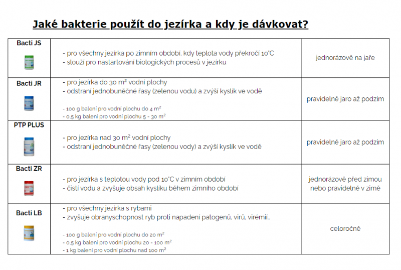 Teplotní rozmezí účinnosti v jezírku je 5 - 25°C, rozmezí pH 6,5 - 9.