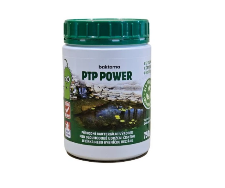 PTP Power je koncentrovaný bakteriální přípravek určený pro zahradní jezírka a menší rybníčky s výskytem vláknité řasy. Obsahuje směs přírodních bakterií a enzymů, které rozkládají organické látky, kal a živiny ve vodě. Tím postupně omezují růst vláknité řasy, zlepšují průhlednost vody a stabilizují biologickou rovnováhu jezírka – bez použití algicidů a chemických zásahů.
