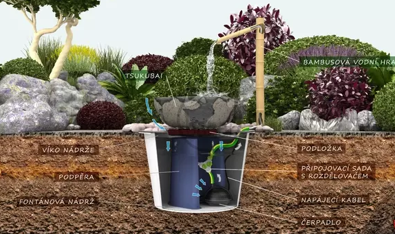 Při umístění bambusové vodn?? hry do zahrady mimo jezírko je nutné vytvořit podzemní rezervoár vody.