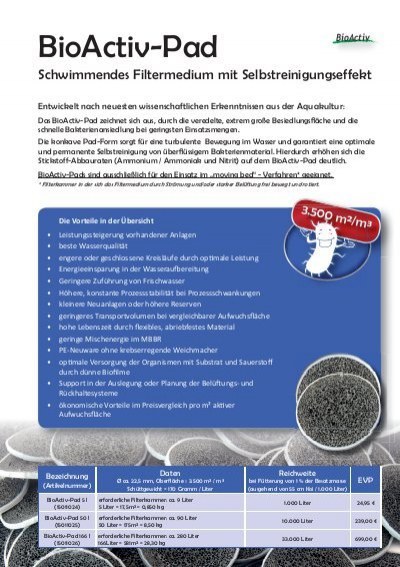 • Přípravek Bio-Activ Pad s cca 3500 m2/m3 chráněného povrchu představuje v současnosti nejmodernější a nejúčinnější BioCareer* přípravek, určený k efektivnímu osídlení mikroorganismy ve filtrační technice. Na jeho vývoj byly kladeny vysoké požadavky a byly použity nejnovější vědecké poznatky renomovaných odborných institutů.