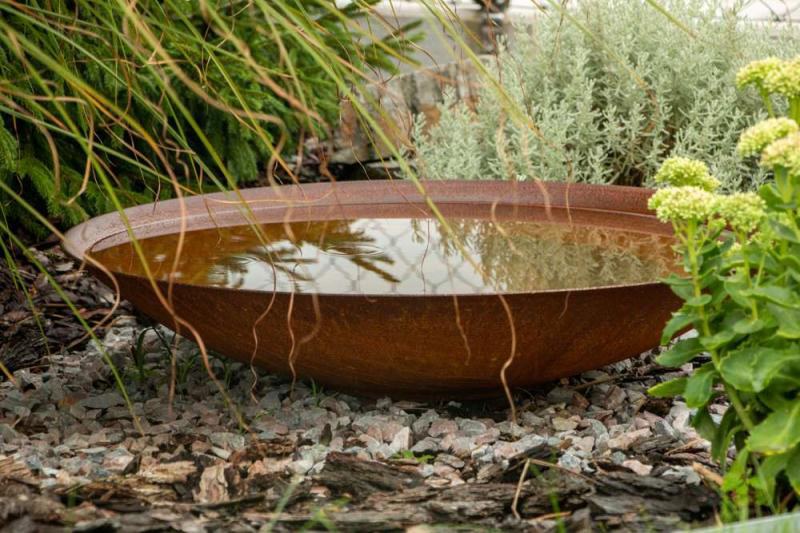Cortenová mísa je multifunkční, nádobu lze použít jako mísu na vodu, pítko pro ptáky nebo na rostliny.