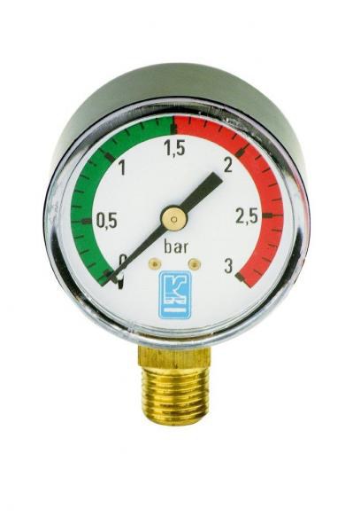 Manometr pro měření tlaku ve filtrační nádobě.