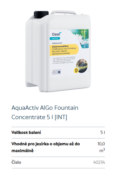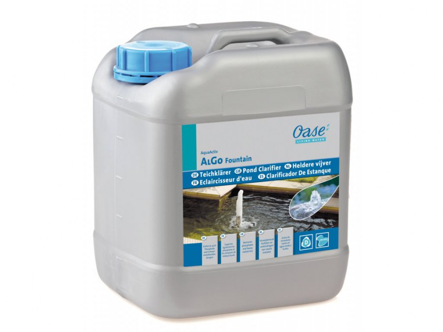 Přípravek Oase AlGo Fountain udržuje vodu čistou a průzračnou ve vnitřních i venkovních vodních prvcích a okrasných fontánách. Čistič vody může být použit jako prevence tvorby řas, zápachu a nehezkých, kluzkých povrchů. Lze také zabránit nevzhlednému usazování vápníku. Po naředění není přípravek AlGo Fountain nebezpečný pro ptáky ani jiná zvířata. Koncentrát je také mimořádně účinný – 5 l stačí na 10m3 vody.