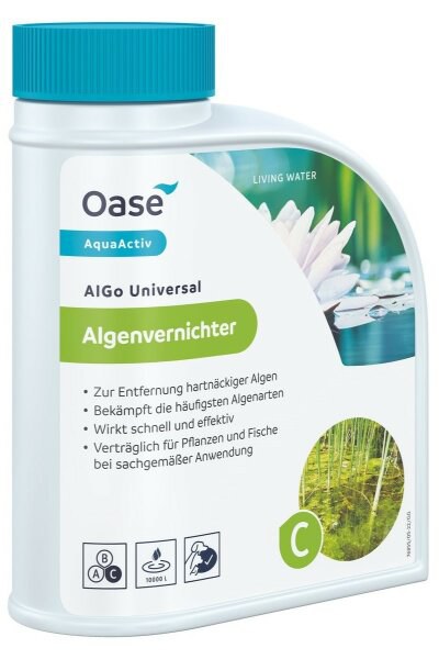 Oase AlGo Universal je univerzální přípravek proti řasám a bojuje jak s řasami vláknitými, tak i slizovými, stejně jako i s jinými druhy řas. Působí v celém jezírku za 2-3 týdny, a je proto vhodný pro oblasti, které jsou obtížně přístupné. Při správném použití je přípravek Oase AlGo Universal rostlinami nebo obyvateli jezírek snášen dobře. Ideální doba pro jeho použití je v době začátku růstu řas.