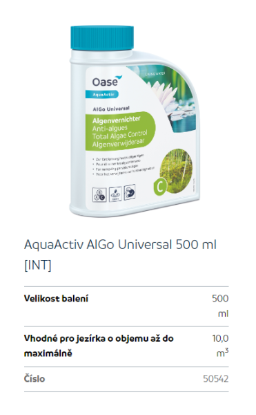 Upřesnění parametrů pro Oase AlGo Universal - proti více druhům řas (500ml na 10m3)