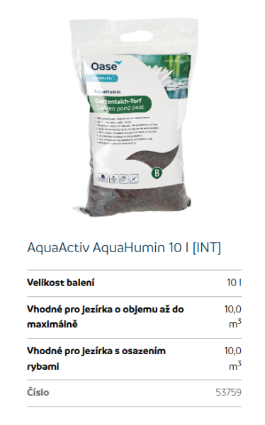 AquaHumin je vysoce koncentrovaný přírodní produkt vyrobený z vysoce kvalitní černé rašeliny určené pro zahradní jezírka. Vysoká hladina huminu přispívá k biologické rovnováze a zdravému růstu rostlin. Díky své hodnotě pH a účinku snižování tvrdosti je ideální pro šetrnou regulaci hodnot vody. Ve vodě jezírka produkuje sotva znatelnou jantarovou barvu a snižuje přísun UV světla do řas. Výsledkem je omezení přílišného růstu řas. AquaHumin neobsahuje žádné chemické přísady, hlísty, choroboplodné zárodky ani látky toxické pro rostliny.