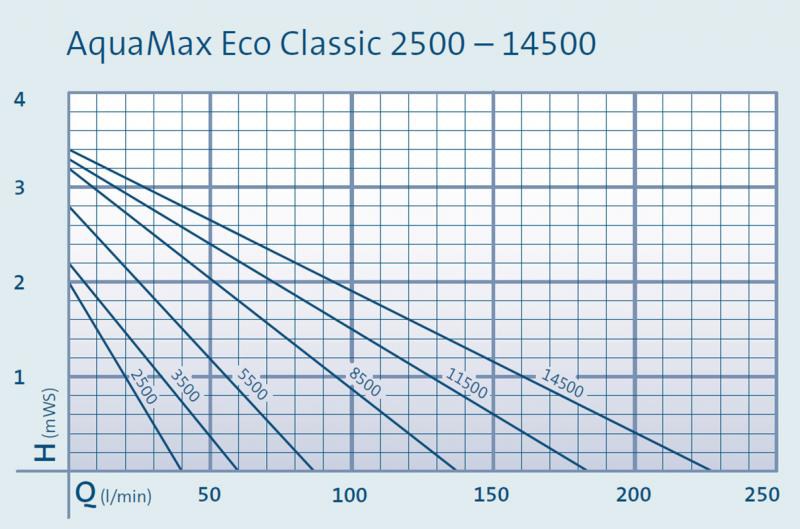 Základní třída filtračních čerpadel a čerpadel pro vodní toky: Čerpadlo AquaMax Eco čerpá vodu z jezírka do vodního toku, vodopádu nebo filtračního systému výkonně a spolehlivě. Obepínající filtr s velkou plochou umožňuje přečerpávání hrubých částic nečistot, jako je odpad z ryb nebo odumřelé části rostlin, až do velikosti 8 mm. Čerpadlo se automaticky vypne v případě chodu naprázdno nebo zablokování, aby nedošlo k poškození jednotky. Výhoda z hlediska životního prostředí: Díky energeticky úspornému EC motoru, čerpadlo AquaMax Classic neustále šetří elektřinu – a tím i peníze. Modely čerpadla mohou bez poškození zamrznout ve sněhu či ledu. Připojení hadice je velmi jednoduché: Na speciální stupňovitou přípojku je možno připojit hadice různých velikostí a kulový kloub lze natočit do jakéhokoliv směru.