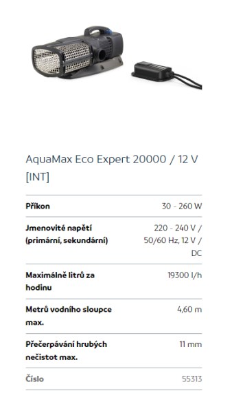 - Výkon čerpadla: 19.300 l/hod., maximální výtlak: 4,6m, příkon: 30-260W.