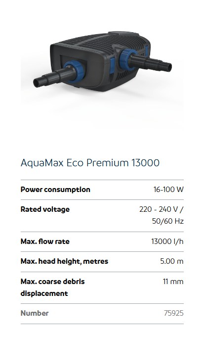 AquaMax Eco Premium je nejnovější generací osvědčených jezírkových čerpadel Oase AquaMax. Zaujme mimořádnou energetickou účinností a vynikajícím průtokem. Šest modelů s různými dopravními výškami pokrývá čerpací výkony od 3,5 do 6 m vodního sloupce. Ve srovnání se svým předchůdcem je AquaMax Eco Premium ekonomičtější, tišší a ještě efektivnější. Je vybaveno rozhraním Oase Control pro digitální monitorování a ovládání čerpadla, Oase Environmental Function Control pro zamezení chodu nasucho a zablokování a Seasonal Flow Control pro sezónní průtoky filtru řízené teplotou. Má také druhý vstup pro satelitní filtr nebo skimmer a je mrazuvzdorná až do -20°C. Externí jednotka příslušenství Oase Eco Control (IP48) umožňuje chytré obousměrné ovládání čerpadla v celoročním provozu.