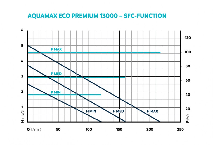 - Patentovaná funkce SFC. Při zapnuté funkci SFC automaticky reguluje v závislosti na teplotě vody výkon čerpadla a dopravní výšku vody, nad 17°C maximální výkon, do 10°C střední výkon a pod 10°C minimální výkon.