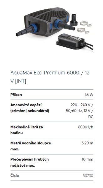 - Výkon čerpadla: min.: 100, l/hod., max.: 6000 l/hod., maximální výtlak: 3,20m, příkon: 55W.
