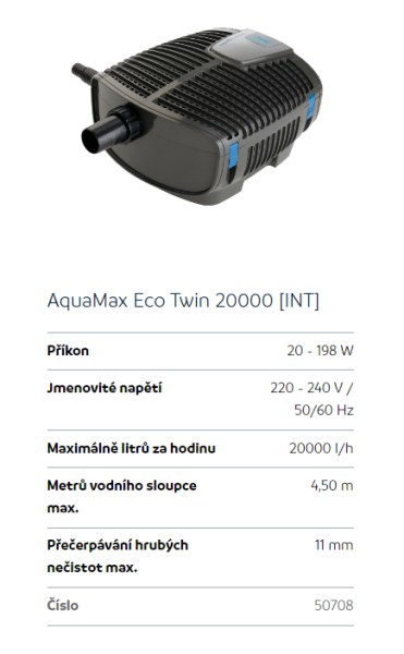 • Výkon čerpadla: 20.000 l/hod., maximální výtlak: 4,5m, příkon: 198W.