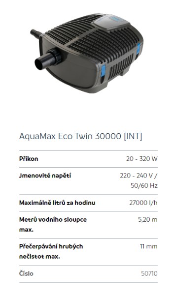 - Výkon čerpadla: 27.000 l/hod., maximální výtlak: 5,2m, příkon: 320W.