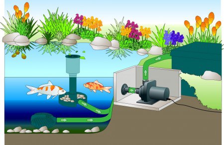 • Satelitní koš umožňuje nasávání vody z jezírka, aniž by do čerpadla vnikly nežádoucí nečistoty, řasy, případně ryby.