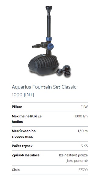 Sada Aquarius Fountain Set Classic je vodní prvek, který může být použit pro realizaci široké řady možností. Díky třem různým nástavcům fontány a jednoduchému mechanickému nastavení výšky fontány lze vodní obrazce opakovaně měnit. Teleskopické prodloužení s integrovanou otočnou hlavou vám umožní doladit fontánu podle potřeby. Druhý samostatně nastavitelný výstup umožňuje připojení k malému vodnímu toku nebo prvku. Základna zajistí bezpečné umístění na dně jezírka.