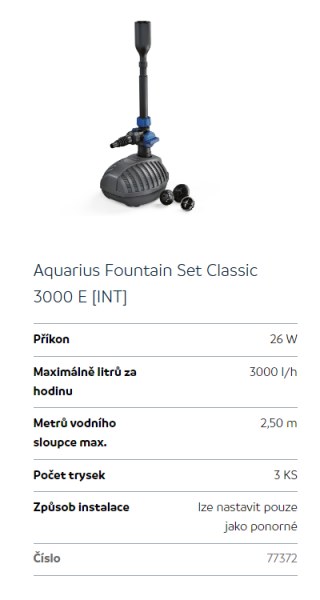 • Sada Aquarius Fountain Set Classic E je vodní prvek, který může být použit pro realizaci široké řady možností. Díky třem různým nástavcům fontány a jednoduchému mechanickému nastavení výšky fontány lze vodní obrazce opakovaně měnit. Teleskopické prodloužení s integrovanou otočnou hlavou vám umožní doladit fontánu podle potřeby. Druhý samostatně nastavitelný výstup umožňuje připojení k malému vodnímu toku nebo prvku. Základna zajistí bezpečné umístění na dně jezírka.