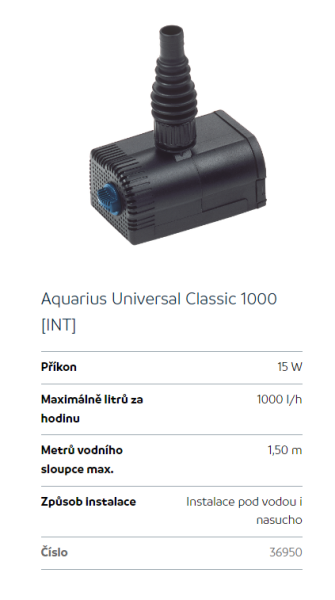 Upřesnění parametrů pro Oase Aquarius Universal Classic 1000 (fontánové čerpadlo)