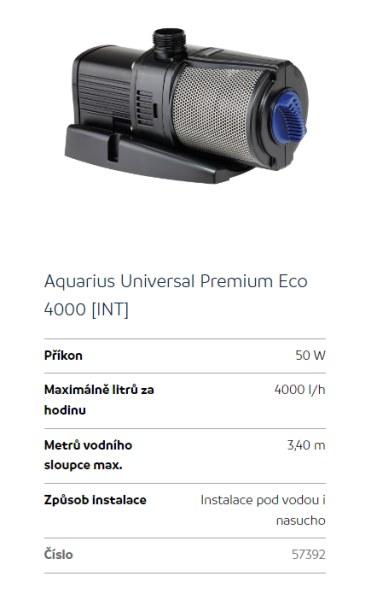 • Výkonný partner pro větší systémy Toto výkonné čerpadlo vám díky extrémně tichému provozu umožní vychutnat si nerušeně zvuk stříkající vody. Mechanická regulace množství vody je možná díky regulátoru Aquarius Universal 3000-12000. Mimo to je možná také instalace mimo vodu. Nasávání je bezproblémové i při nízké hladině vody. Uživatele potěší nízká spotřeba energie, protože čerpadlo funguje energeticky účinně. Díky vysoce kvalitní povrchové úpravě z nerezové oceli jsou atraktivní a díky patentované protimrazové ochraně je jejich použití bezpečné až do teploty –20 °C.