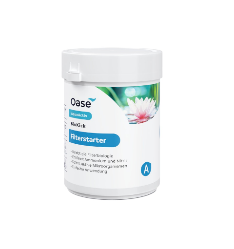 Čistě biologické startovací bakterie Oase AquaActiv BioKick aktivují biologii filtru a během několika týdnů uvedou váš jezírkový filtr do plného výkonu. Okamžitě začnou detoxikovat dusitany, amonné ionty a amoniak. Suché práškové startovací bakterie Oase BioKick urychlují kolonizaci biofilmu v jezírkovém filtru. Jsou založeny na heterotrofních bakteriálních kmenech a okamžitě stimulují detoxikaci amoniaku a dusitanů v jezírku. Bakteriální kmeny s více než 10 miliony aktivních mikroorganismů na 1ml jsou specialisty na rozklad organického materiálu, jako jsou rybí výkaly. BioKick je čistě biologický přípravek, který neobsahuje patogenní zárodky. Je vhodný pro použití v nových jezírkových filtrech i po rozsáhlém čištění filtru nebo výměně vody a během několika dnů přivede filtrační systém k maximálnímu výkonu.