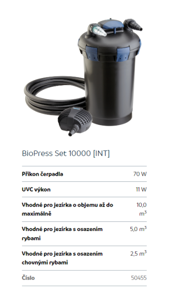 Upřesnění parametrů pro Oase BioPress Set 10000 (tlakový filtrační set na 2,5m3)