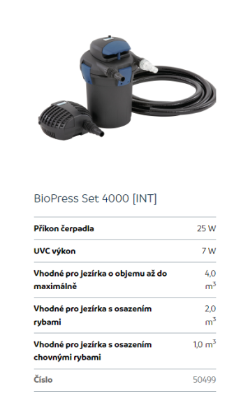 Upřesnění parametrů pro Oase BioPress Set 4000 (tlakový filtrační set na 1m3)