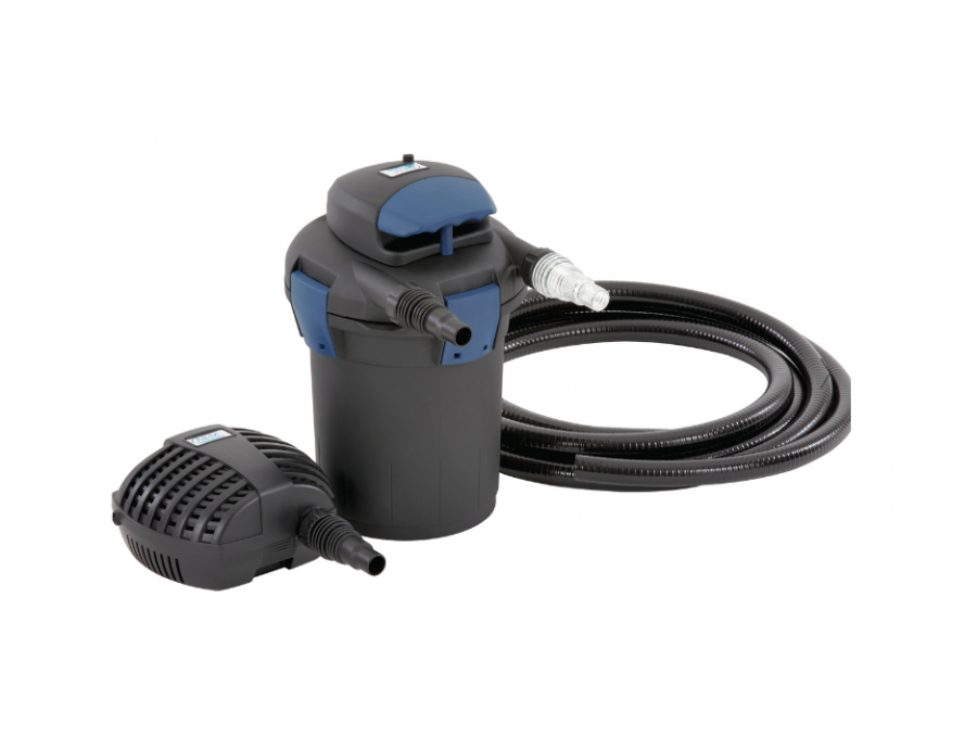 Úplná filtrační sada: instalace, připojení a je hotovo. Garantovaná čistá voda prostřednictvím ideální kombinace filtru, čerpadla a UVC technologie pro sterilizaci. Filtr je zakopán až po kryt a na zahradě je prakticky neviditelný. Údržba je velmi snadná díky patentované čisticí funkci v krytu. Stupeň nahromadění odpadu na filtru je vidět zvenčí. V případě potřeby může tento pevný tlakový filtr také čerpat vodu do vyššího vodního toku.
