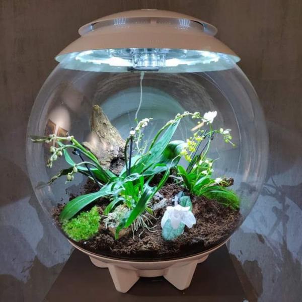Oase biOrb AIR 60 je elegantní terárium ve tvaru koule vyrobená z foukaného akrylátu, který má až dvakrát vyšší izolační vlastnosti a o 23% vyšší průzračnost oproti klasickému sklu. Sklo nechává projít 70% světla, akrylát 93%. biOrb AIR 60 se automaticky postará o mikroklima potřebné pro pohodlné pěstování tropických rostlin. Vytváří klima podobné jejím přirozeným podmínkám pod tropickými lesními společenstvy, což má za následek, že tropické rostliny jako jsou třeba orchideje rostou jako v přirozeném prostředí. Do terária můžete umístit širokou škálu rostlin, nejvhodnější jsou pomalu rostoucí tropické rostliny, které k správnému životu potřebují hodně vlhkosti, naopak sukulenty nebo rostliny, které upřednostňují suché prostředí nejsou do terária Oase biOrb AIR 60 vhodné. Navíc je v terárku OASE biOrb AIR 60 možné kromě rostlin chovat i drobné tropické živočichy - například chameleony trpasličí, gekony denní nebo různé druhy hmyzu všech velikostí a barev, od kudlanky nábožné až po stonožky nebo pavouky.