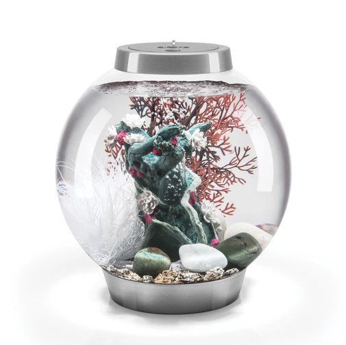 Vše v jednom klasické kulaté akvárium biOrb s LED osvětlením a objemem 15l pro pěstování vodních rostlin a živočichů ve stříbrném provedení.