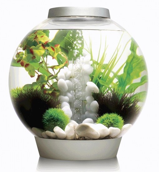 Vše v jednom klasické kulaté akvárium biOrb s MCR LED osvětlením a objemem 30l pro pěstování vodních rostlin ve stříbrném provedení.