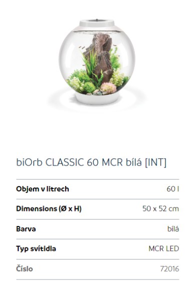Upřesnění parametrů pro Oase biOrb CLASSIC 60 MCR (akvárium bílé)