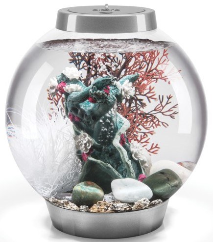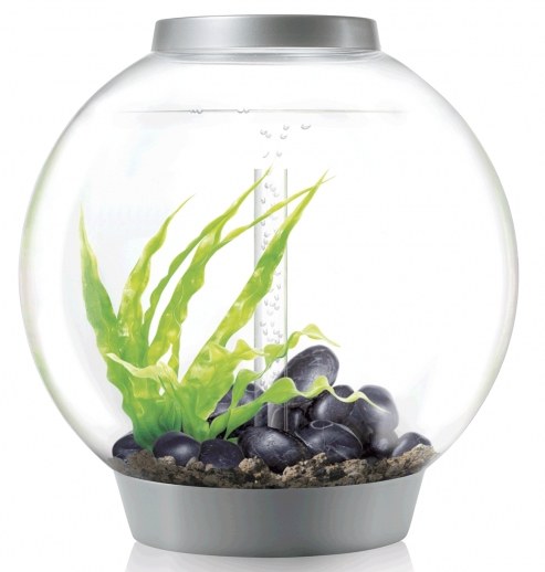 Vše v jednom klasické kulaté akvárium biOrb s MCR LED osvětlením a objemem 60l pro pěstování vodních rostlin a živočichů ve stříbrné barvě.