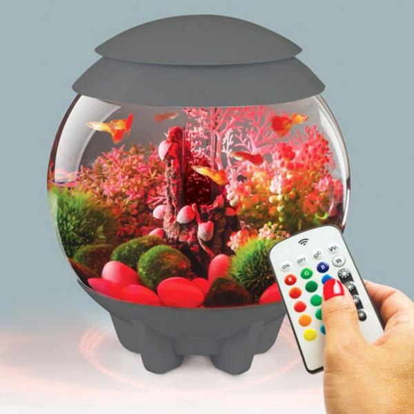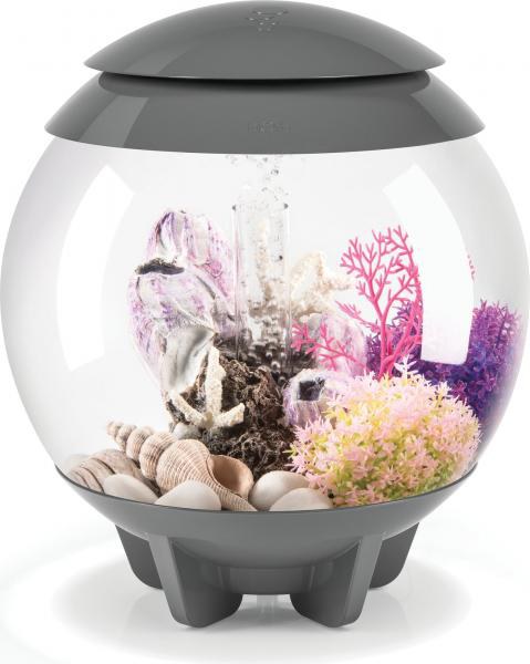 Pokud hledáte klasické kulaté akvárium, které ale bude vybaveno vším co potřebujete pro chování Vašich vodních mazlíčků, akvárium biOrb HALO je skvělá volba. Design je klasický kulovitý, přesto to není jen nudná koule. Akvárium nestojí na klasickém podstavci, ale na 5 plastových nohách, které mu dodávají vzdušnost a eleganci. Akvárium je vybaveno patentovaným filtračním systémem, který zajistí křišťálově čistou vodu bez zbytečné námahy. Filtrační zařízení je ve spodní části akvária, takže veškerý nepořádek přirozeně padá do filtrační oblasti, navíc je voda vedena tak, aby po cestě do filtru s sebou vzala co nejvíce nečistot. Čistá voda je následně provzdušněna a provzdušňovací trubicí poslána zpět do hlavní části akvária, kde se celý proces opakuje. Akvárium je vyrobeno z akrylátu, který má lepší vlastnosti než klasické sklo. Má 93% průhlednost, což ho činí nejprůhlednějším materiálem, který je známý. Používá se mimo jiné v oknech letadel. Má výborné izolační vlastnosti, je lehký, přesto velice odolný. V balení akvária se nachází samotné akvárium, filtrační zařízení i čerpadlo. Instalace je tedy velice snadná a rychlá, za pár minut můžete akvárium napustit vodou a kochat se. MCR LED osvětlení umožňuje rozehrát akvárium až 16 barvami, zároveň lze LED diody nastavit ve 4 časových intervalech a ovládat bezdrátově pomocí přiloženého ovladače.